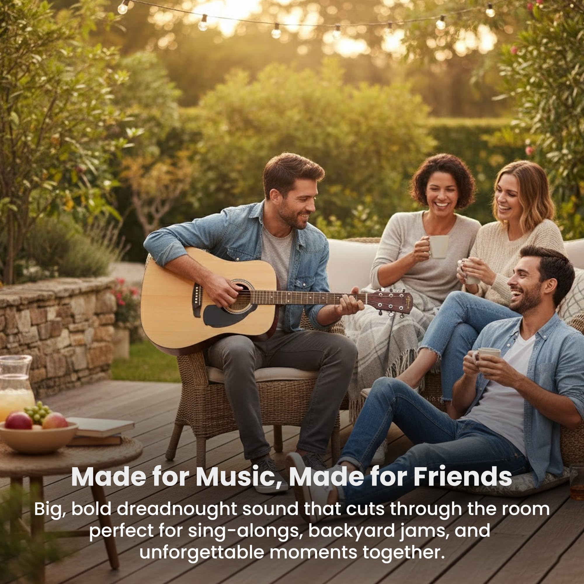 DREADNOUGHT SOUND: The dreadnought body produces a bold and rich sound with deep tones and warm midrange.