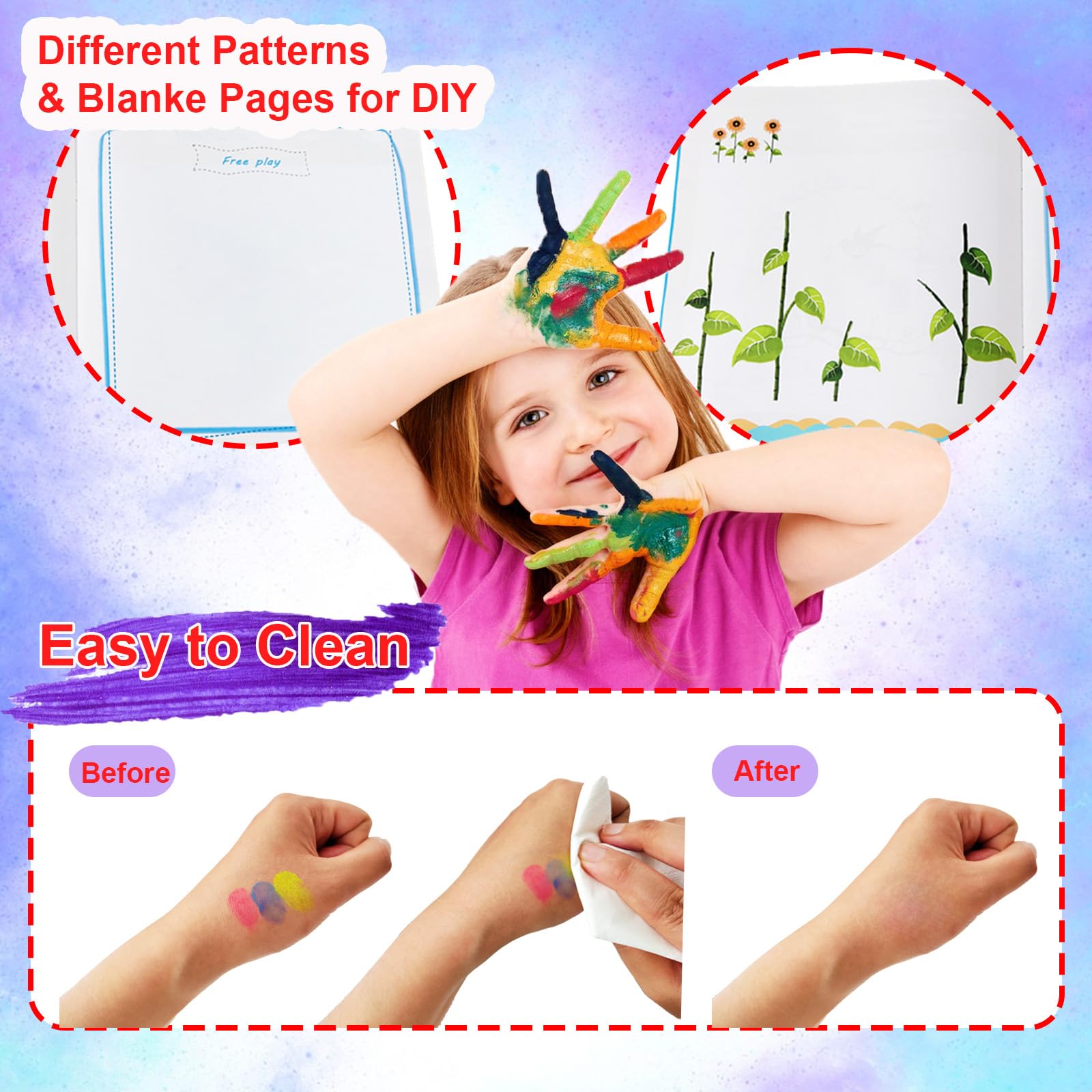 Easy To Clean:toddler paint are easy to clean up,just use the wet tissue wipe. No need to worry that washable finger paint for toddlers will not be washed off if it gets on the body
