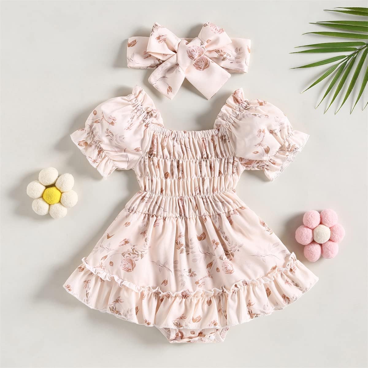 Design: Baby girls romper has puff short sleeves,bubble romper,smocked dress, pleated ,ruffled hem,spots print,cow print pattern makes baby girls fashionable and lovely
