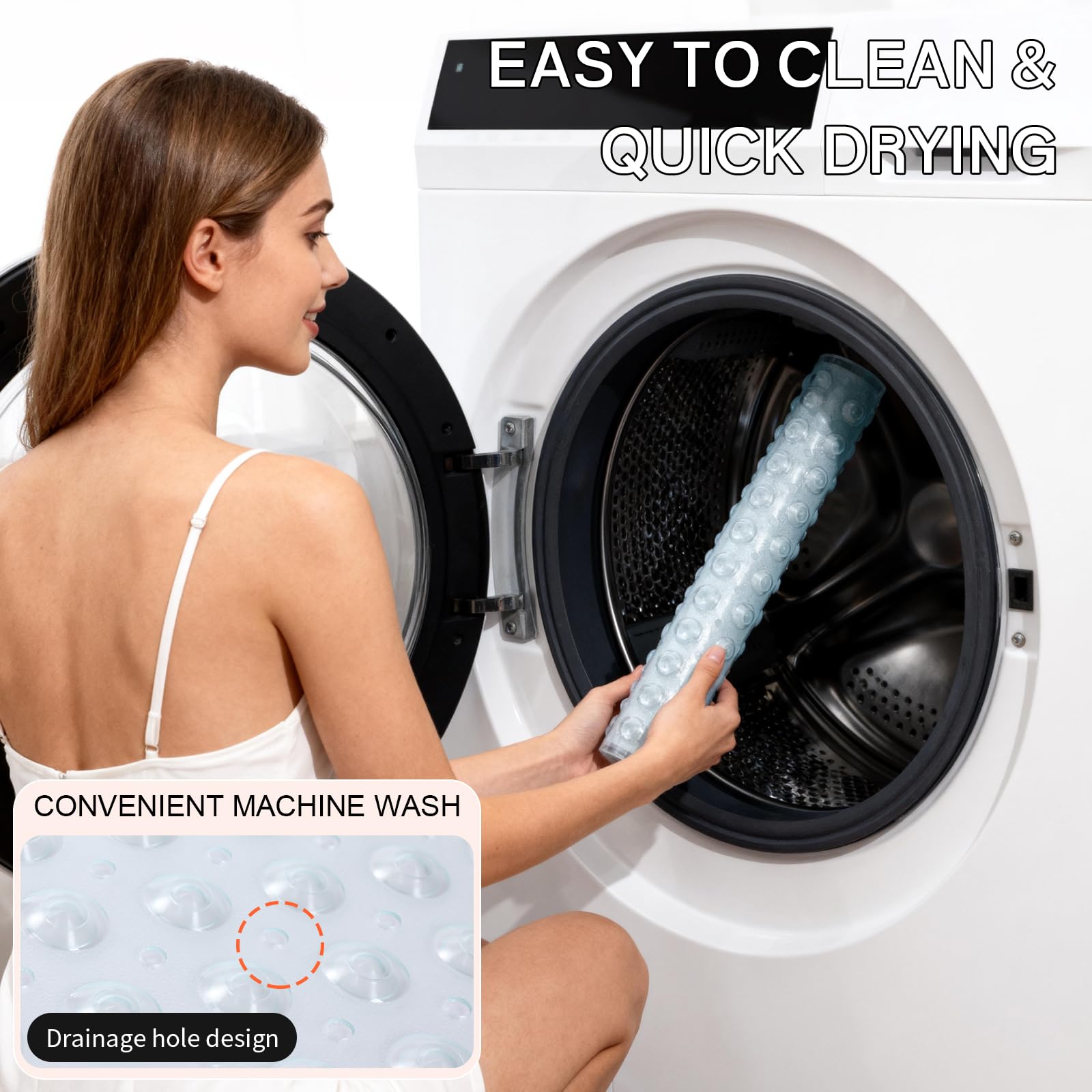 MACHINE WASHABLE: Conveniently machine-washable and easy to maintain, this non-slip bathtub mat can be effortlessly cleaned. Simply toss it into the machine and wash it on a cold water setting. Afterward, hang it to dry. We recommend periodically rinsing and air-drying the shower mat.
