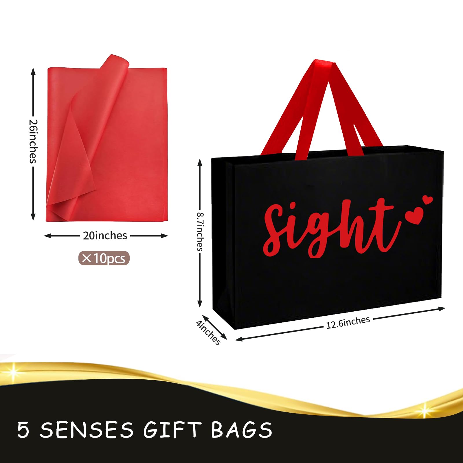 Size details: each sense gift bags measures 12.6 x 8.7 x 4 inches while accompanying tissue papers measure 19.7 x 26 inches, designed to accommodate uniquely shaped gifts, these 5 senses gift bags will help you create the great set of presents, and to show your love and add the last touch to your present