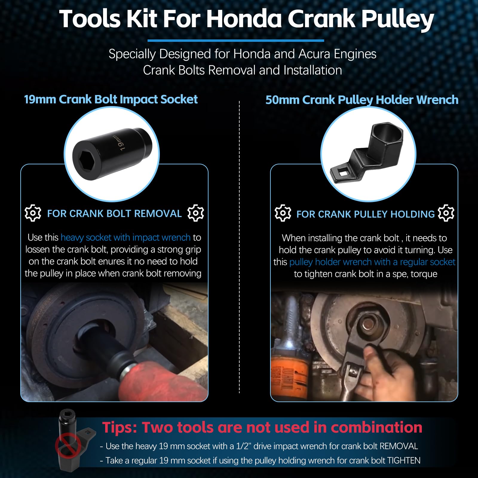 What You Get -- 1 x 19mm crank bolt socket; 1 x 50mm Crank pulley holding tool. This compatible with Honda Crank Pulley Tool Set is specially designed for crank bolt removal and installation.