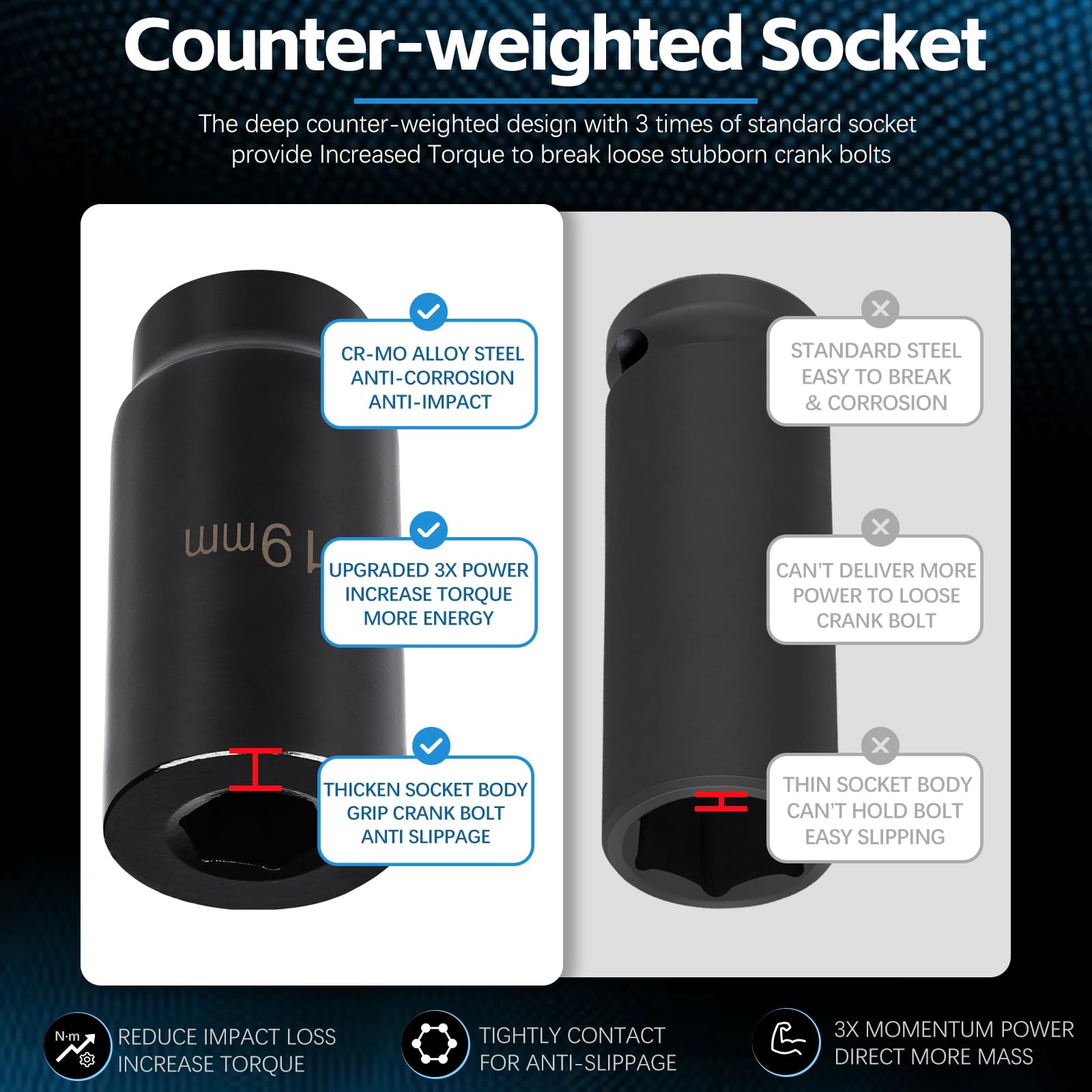 Deep Counter-Weighted Socket --- Reduce the impact losses commonly found in standard socket, allowing break the stubborn crank bolt loose easily