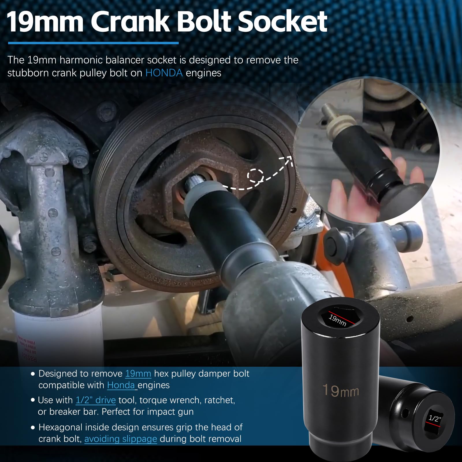 19mm Harmonic Balancer Socket --Used on Honda engines that use a 19mm hex pulley damper bolt or other 19mm applications. Used with an impact wrench to loosen the crankshaft bolt without holding the crank pulley
