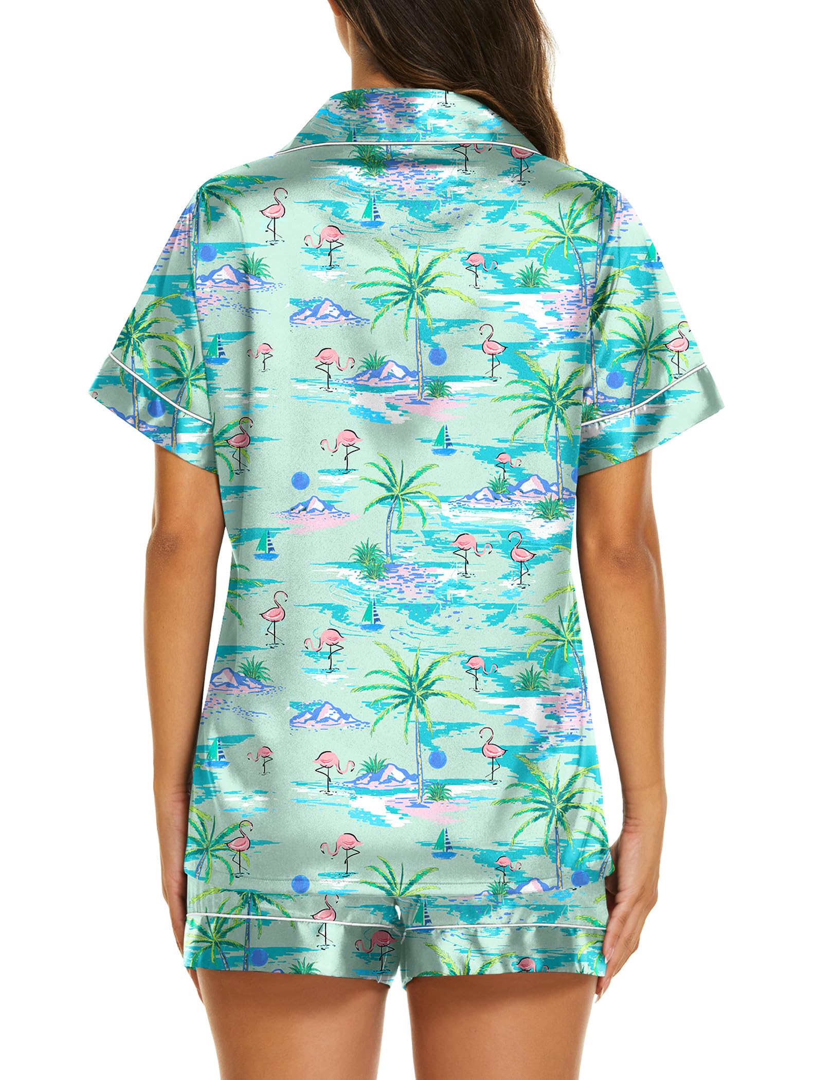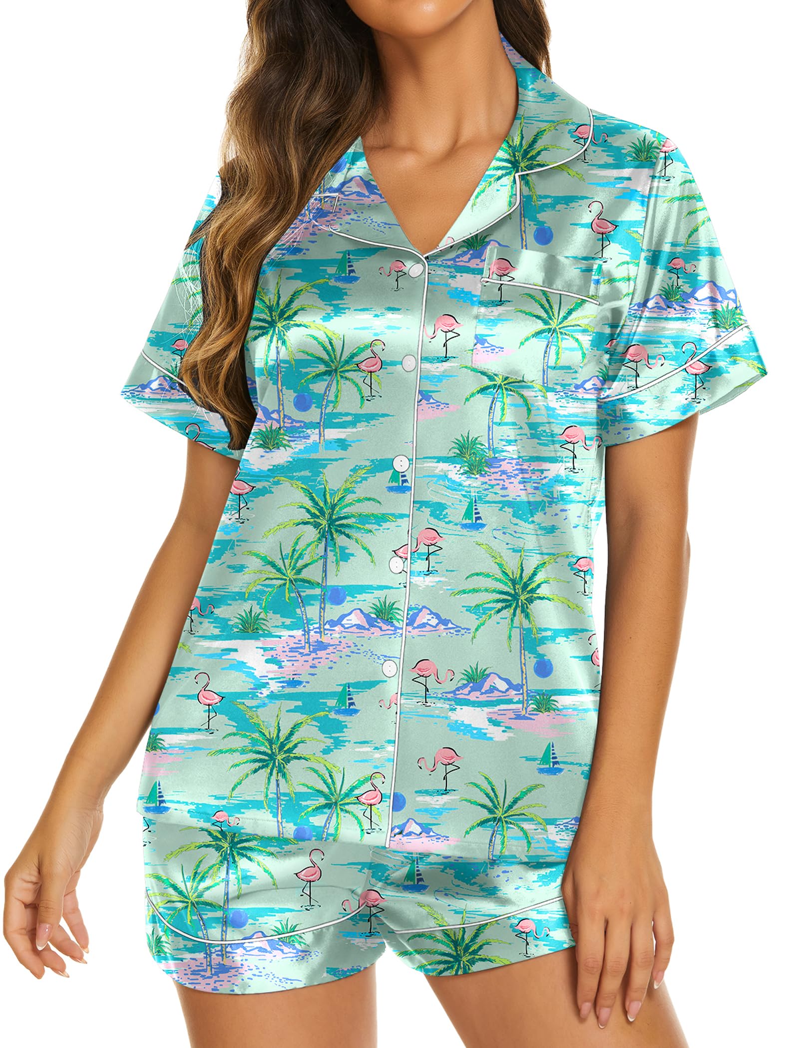 Elegant design:Short sleeve pajama tops, button down front,notch lapel collar and one chest pocket.Matching pajama shorts for women with stretchy elastic waist that fits for any body size.Lightweight and Breathable,perfect for sleeping, lounging, or morning coffee in effortless grace