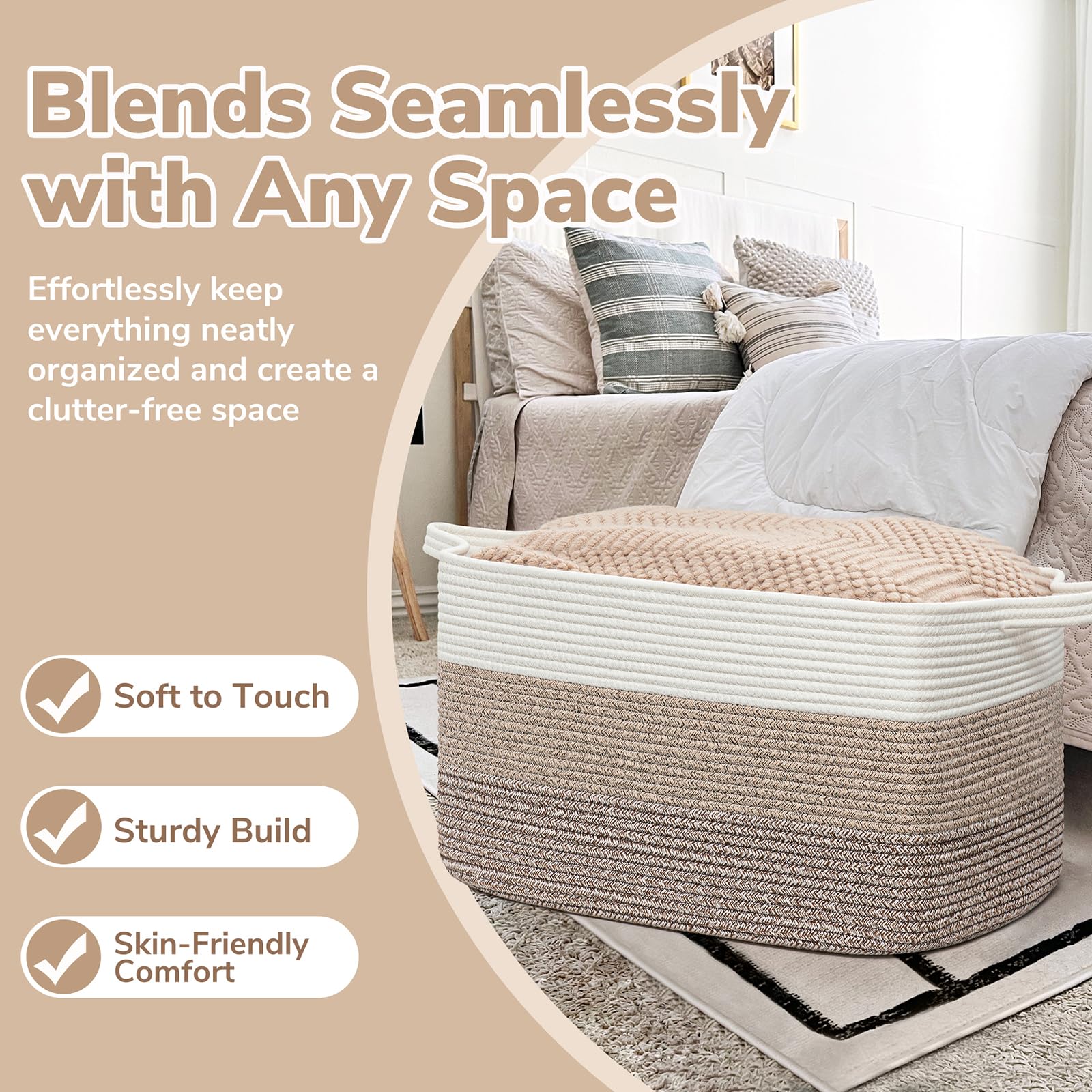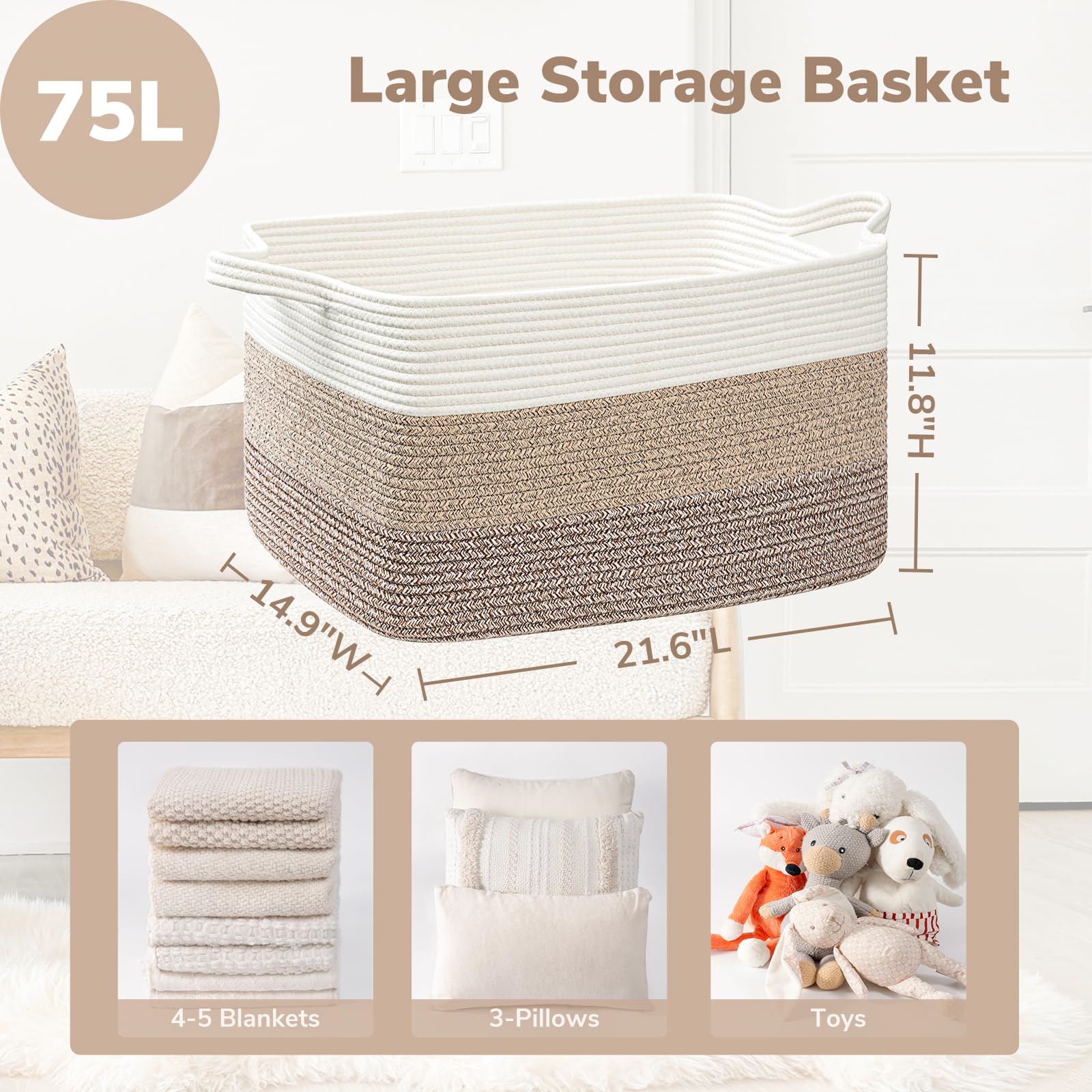 Extra Large Blanket Basket: measures 21.6" Lx 14.9" Wx 11.8" H, providing ample space for 4-5 throw blankets, 3 big pillows, or 2 throw-sized quilts. Keep your home organized and clutter-free with ease