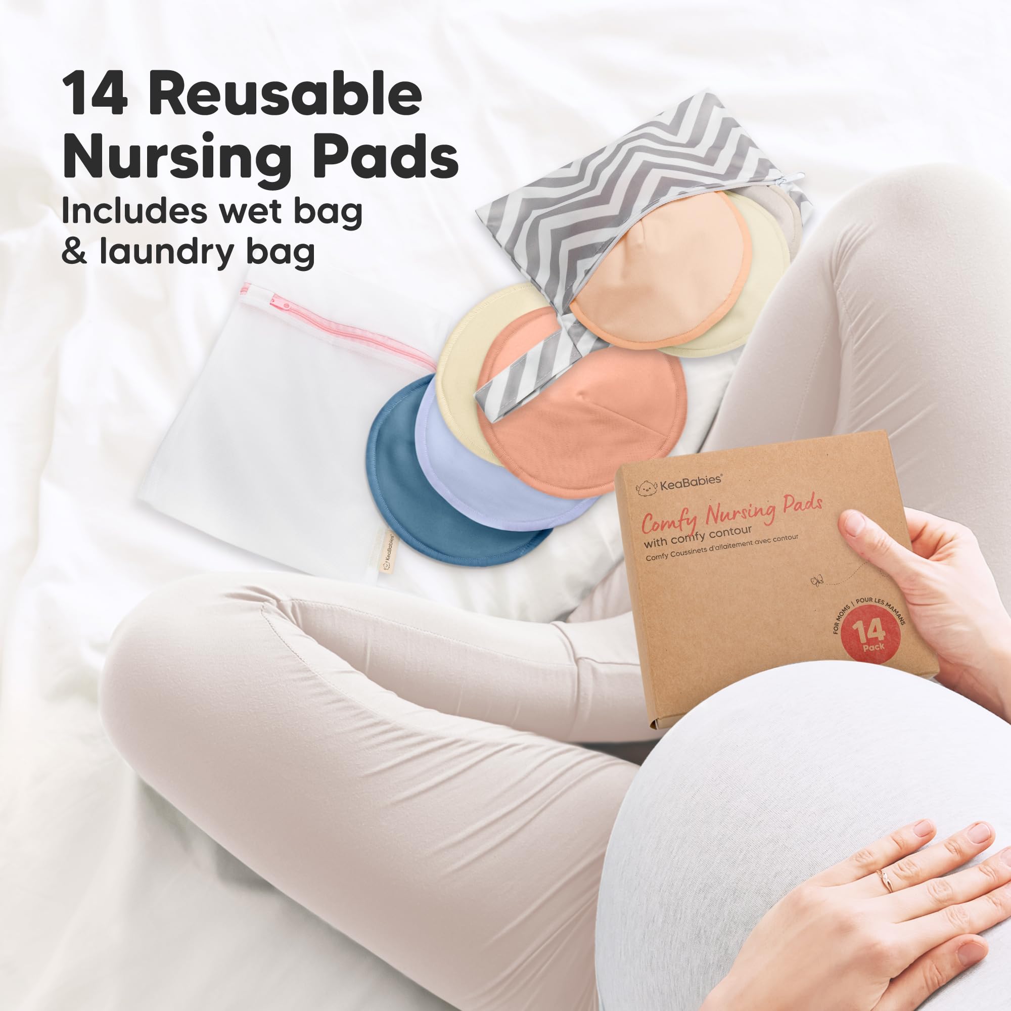 14 Highly Absorbent Nursing Pads + laundry bag + wet bag. Your week’s supply of nursing pads that offer optimum protection and a simplified washing experience. No more worries about missing breast pads!