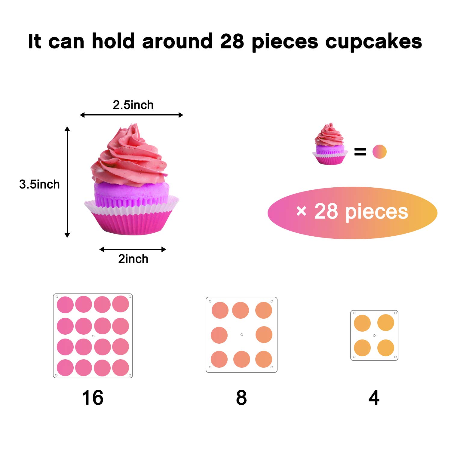 IMPRESSIVE DETAILS: By using Acrylic Rod with Screws instead of Tube to make this cupcake stand straight and stable, The cupcakes stand is extra large and can hold up to 28 cakes of 2.5” diameter or the equivalent of 12 lb. of food.