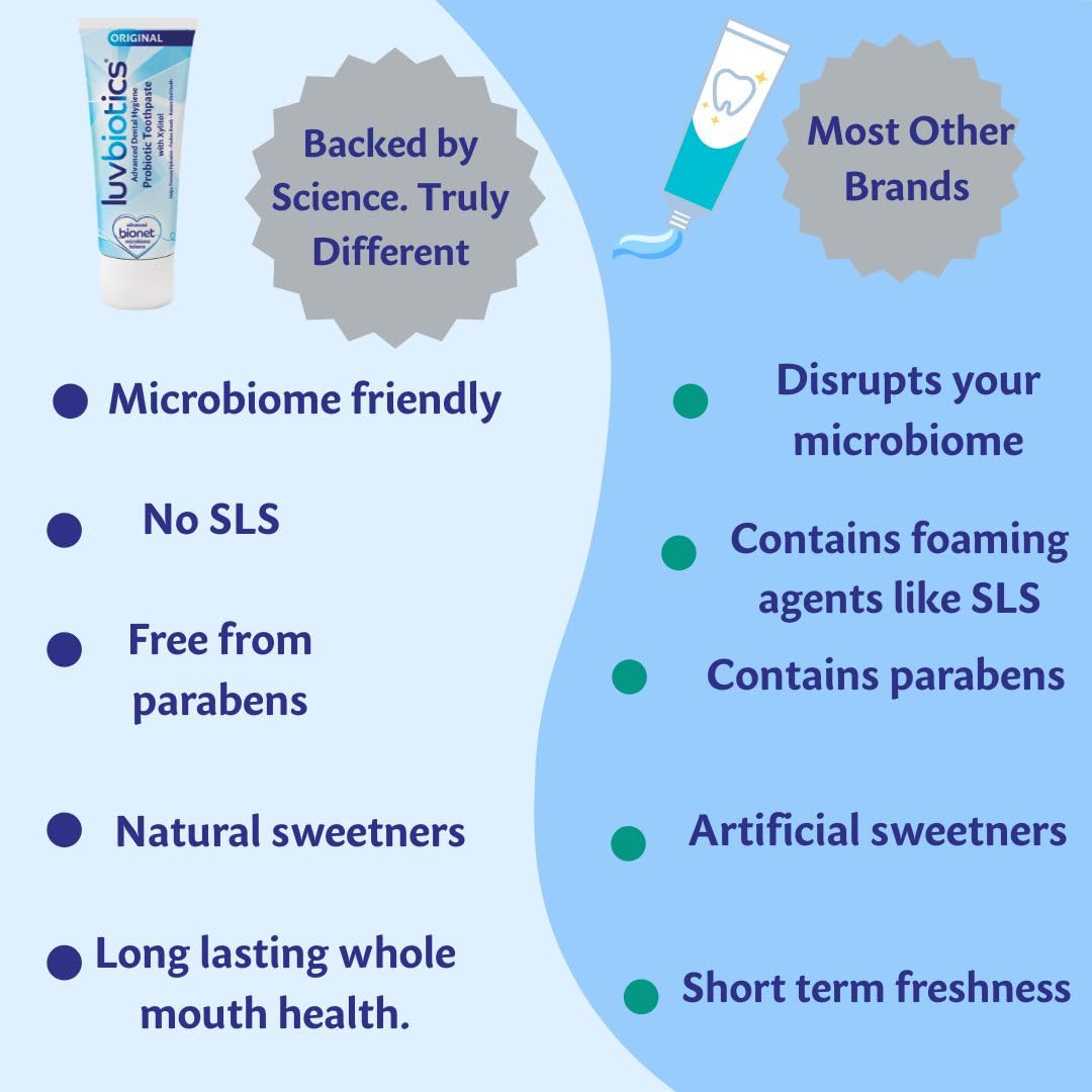 FIRST TO THE MARKET WITH PROBIOTICS - Luvbiotics dental range is the first brand in Uk to use dental probiotics in formulations. Dental probiotics are scientifically validated to improve oral hygene through balancing oral flora. They promote the growth of beneficial micro-organisms while reducing the bad organisms which cause dental issues