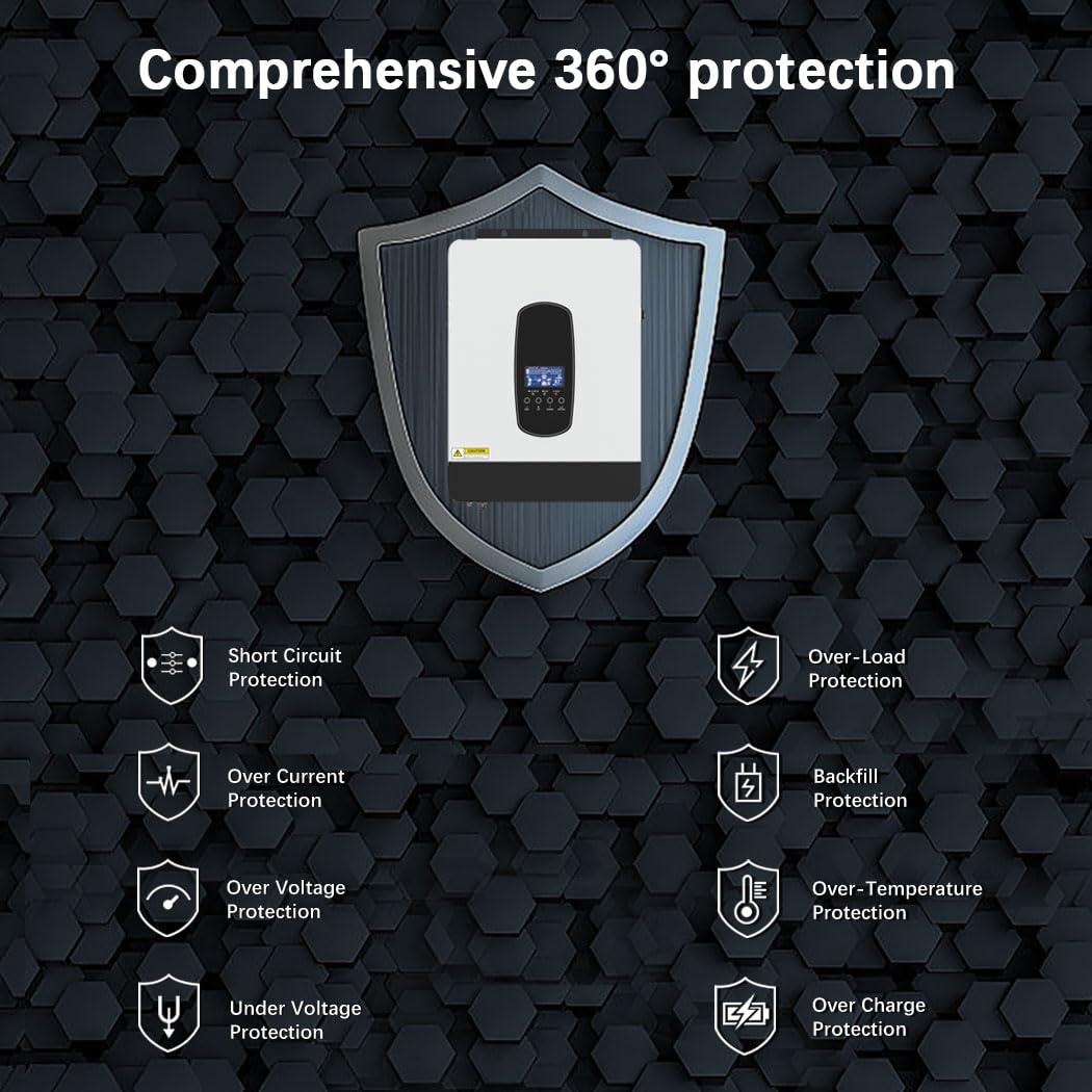 【MULTIPLE CHARGING MODES】Off Grid Solar Inverter have 4 charging modes are optional, i.e. Only Solar, Mains Frist , Solar Frist and Mains & Solar hybrid charging;and 3 output modes are available, i.e. Solar Frist, Mains Frist and SBU Priority, uninterrupted power supply to meet different application requirements. And compatible to mains voltage or generator power, Auto restart while AC is recovering.
