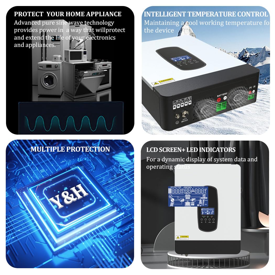 【WIDE RANGE OF USES】MPPT Inverter Charger Pure sine Wave 2200W for RV Camping Boat Home Emergency ect.. Can be accessed to a variety of household and office loads, including Oven, rice cooker, lamps, televisions, fans and other AC loads.(Be careful not to install it near the bedroom, the fan will make a sound when the inverter is running.Avoid affecting your rest (expect 50-70 db)