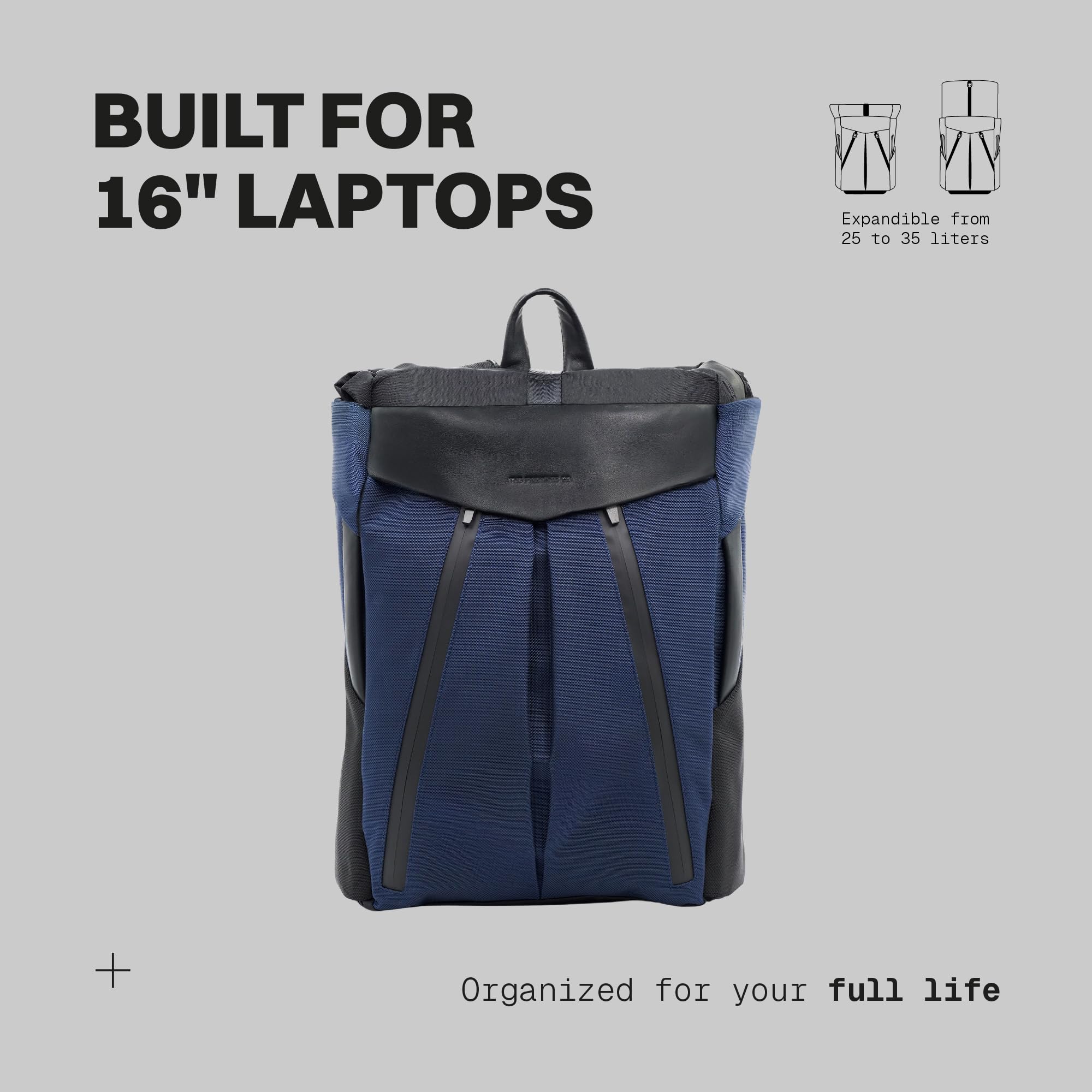 Slim minimalist profile reduces bulk while providing structured support; compact silhouette slides under outerwear, offers organized pockets and a padded sleeve for essentials on crowded commutes