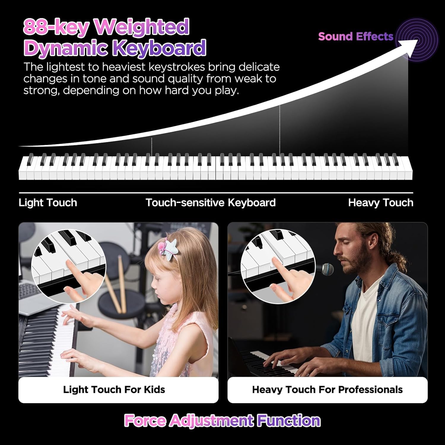 【88 Keys Weighted Dynamic Keyboard】This keyboard piano offers a realistic, traditional playing feel that responds to the intensity of the key press and generates different tonal nuances that sound authentic like a traditional piano. The piano keyboard can be set to two modes - light and heavy touch. The light touch is suitable for beginners, while the heavy touch is suitable for professional players