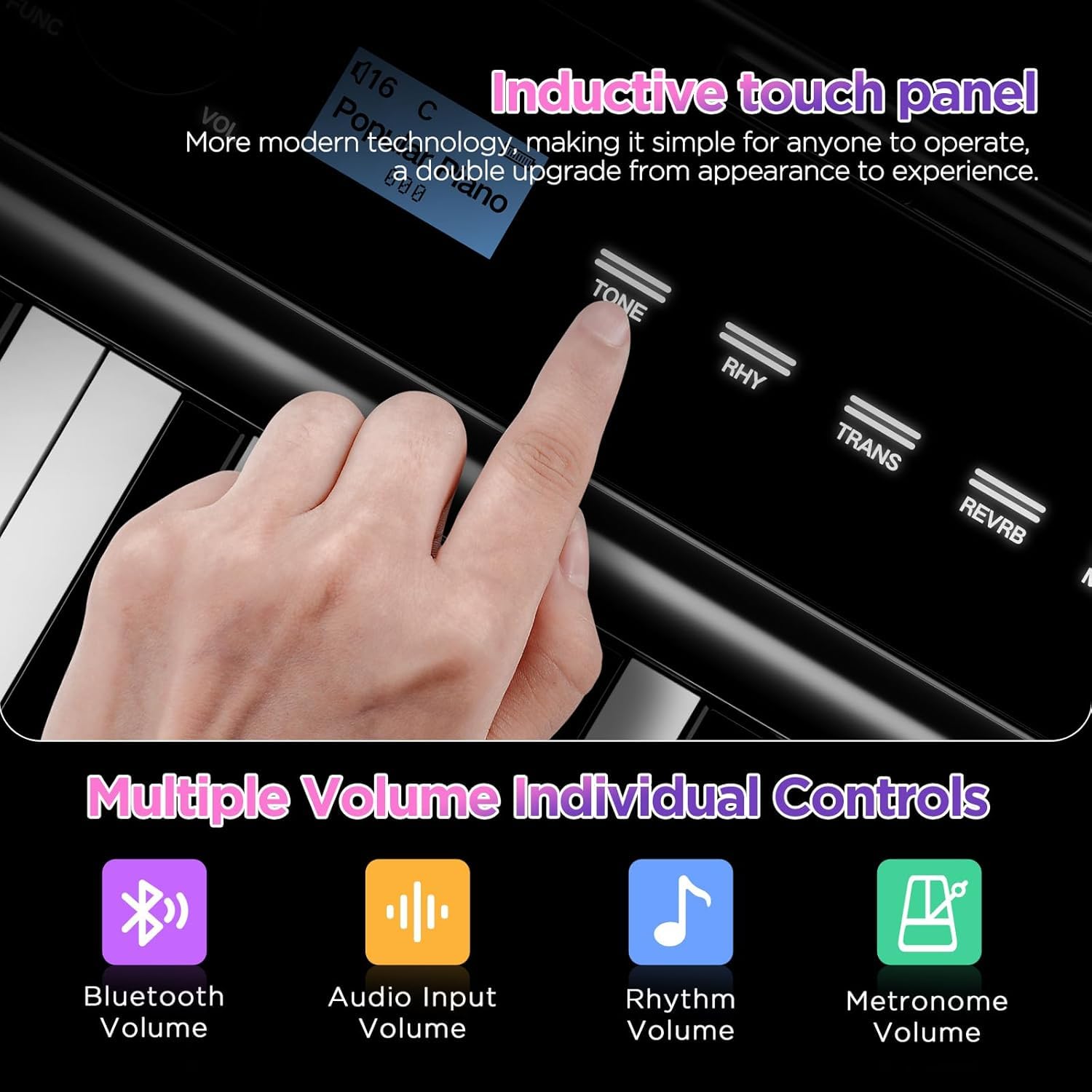 【Touch-Sensitive Control Panel & Ultra-Thin Design】The 88 key piano keyboard is equipped with a touch-sensitive control panel, allowing for easy, intuitive operation. The modern design of the piano features an ultra-thin build that make sure portability and convenience. Whether you’re adjusting settings for practice or performance, the responsive control panel makes it simple. The compact and lightweight design makes this digital piano perfect for outside musician