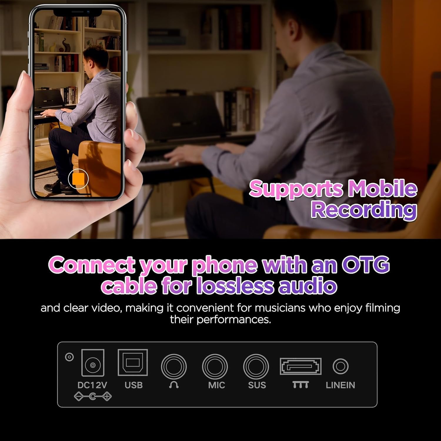 【Inbuilt Video and Audio Recording Feature】The digital piano 88 weighted keys comes with a built-in video and audio recording feature, perfect for musicians who want to document their performances. Using an OTG cable, you can connect your phone to the electric keyboard piano for lossless audio and clear video capture. This feature is suitable for practice reviews, sharing performances online, or simply preserving your musical progress with high-quality sound and visuals