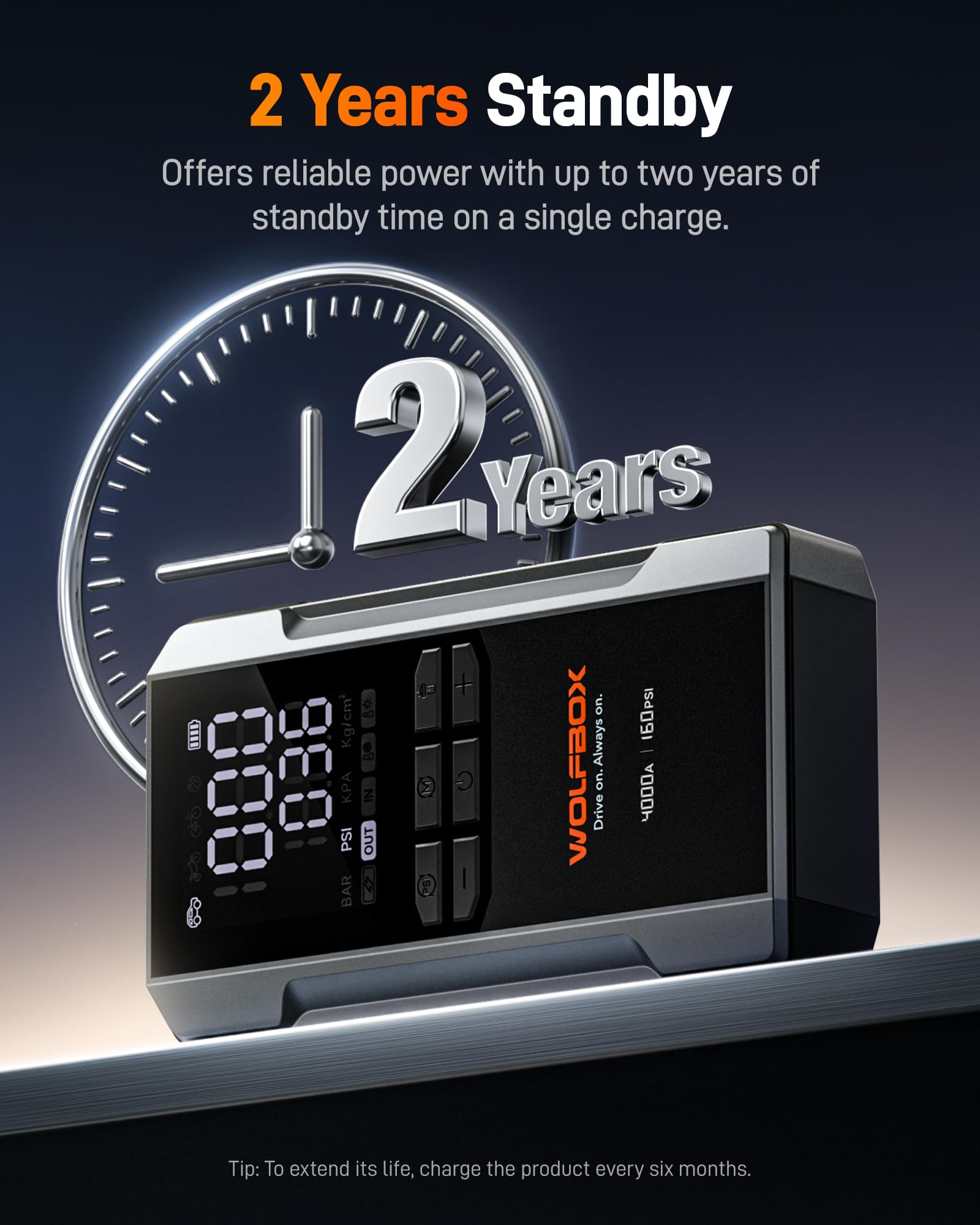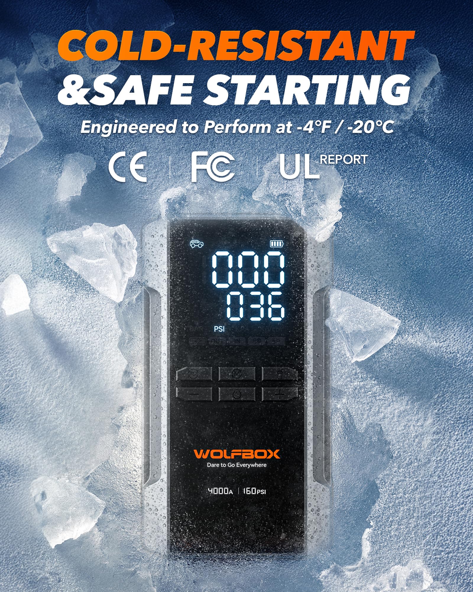 Operates down to -4°F & 10 Types Protections - The portable battery jump starter with air compressor, rated at IP64 for protection, ensures resilience in harsh environments. Operates at -4°F and survives the cold