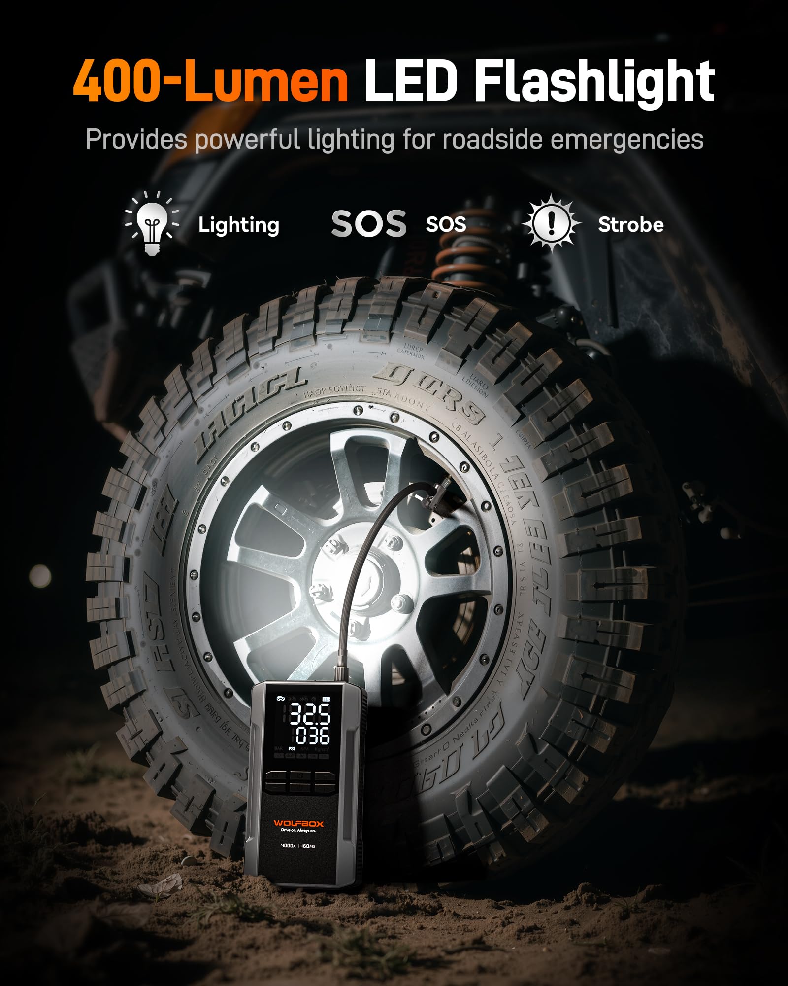 Newly Upgraded All-in-one Jump Starter and Air Compressor - Equipped with a powerful 88.8Wh battery and a peak current of 4000A, it can start a completely dead 12V car battery (up to 10L gas or 10L diesel engines). It can also inflate the tires of pickup trucks and below, combining multiple functions in one device