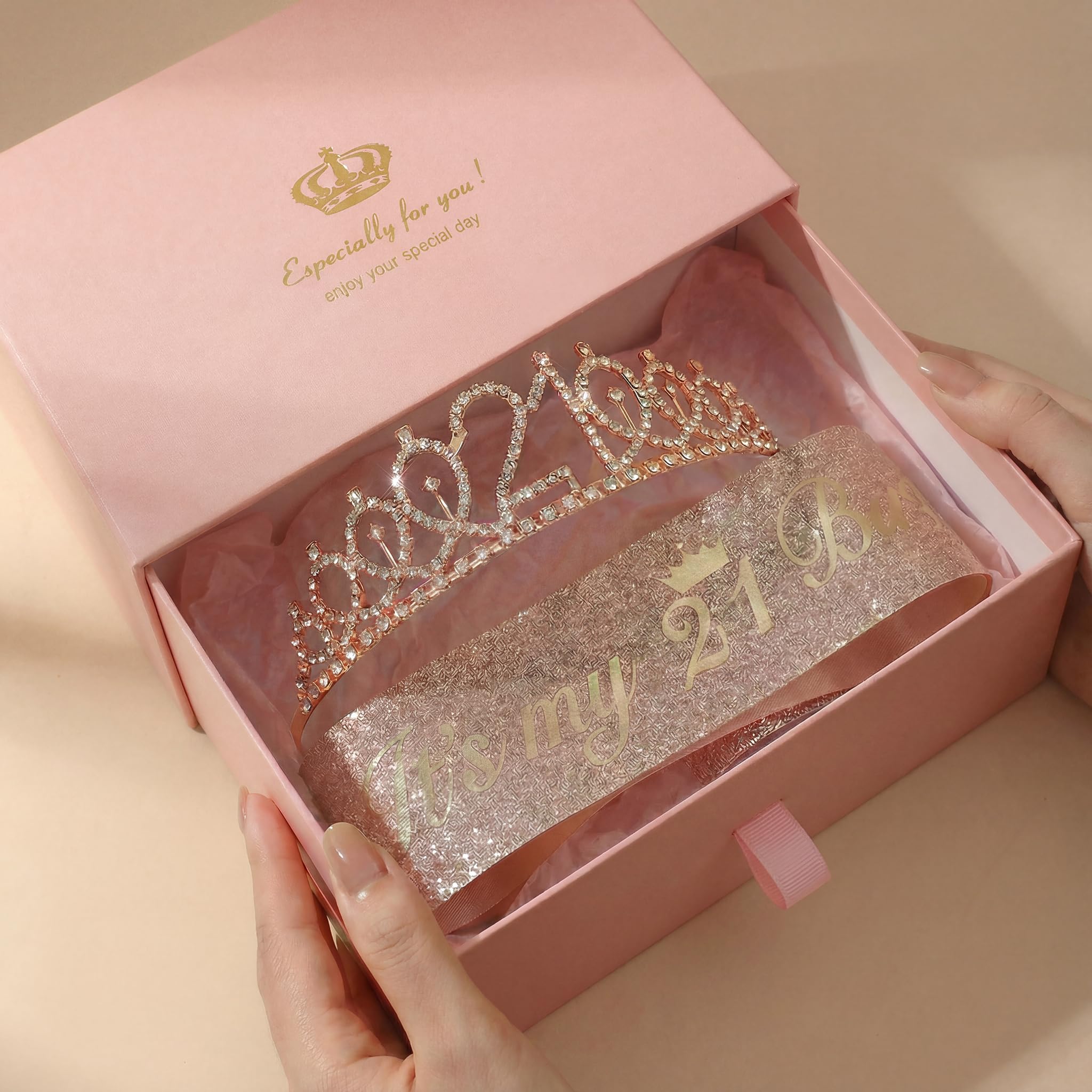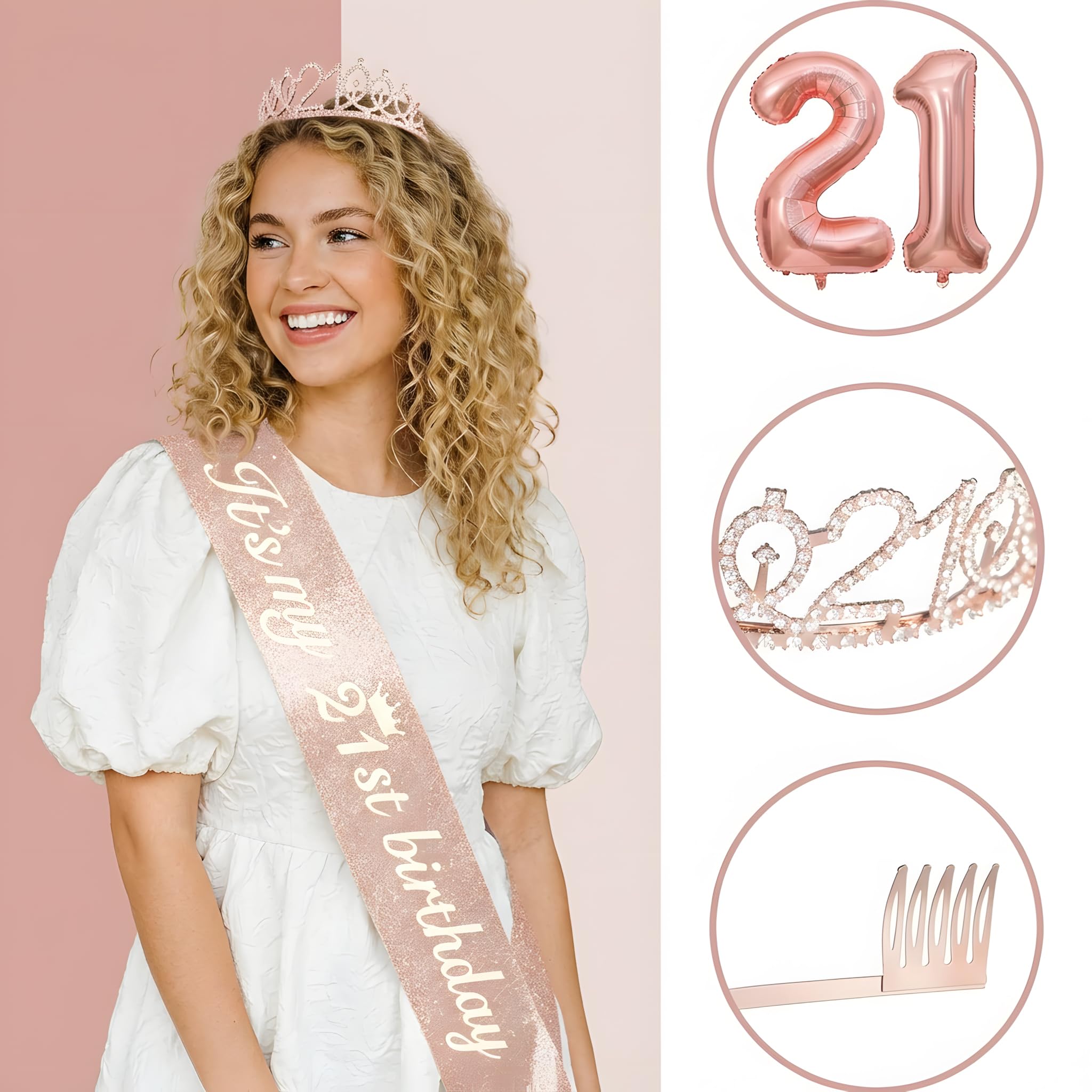 💝Glittery Sash & Cake Topper: The 63-inch rose gold sash is crafted from soft glitter satin with stylish foil lettering, and comes with a safety pin for a perfect adjustable fit. A matching rose gold “Happy 21st” cake topper (rose gold glitter paper) is included to add an eye-catching accent to her birthday cake.