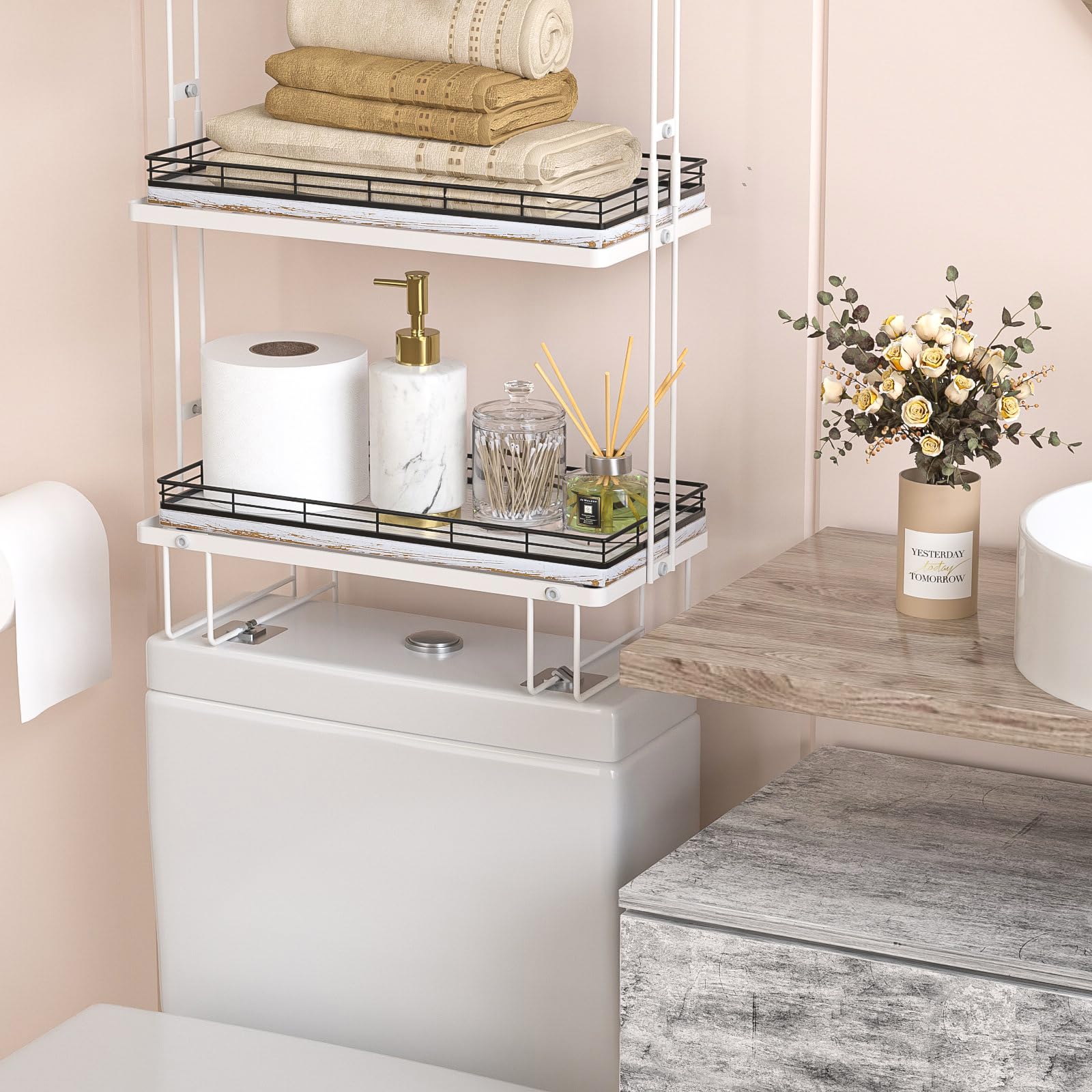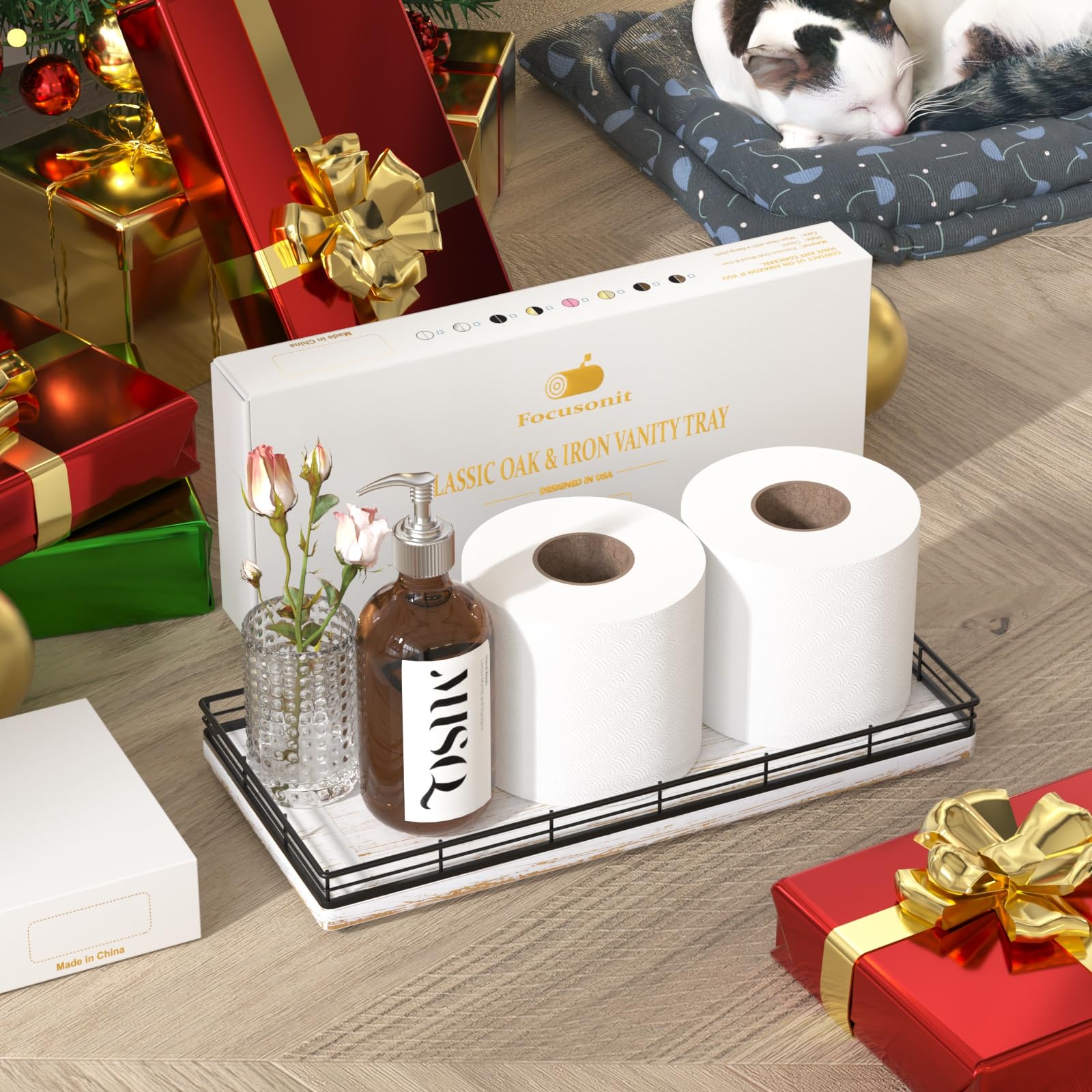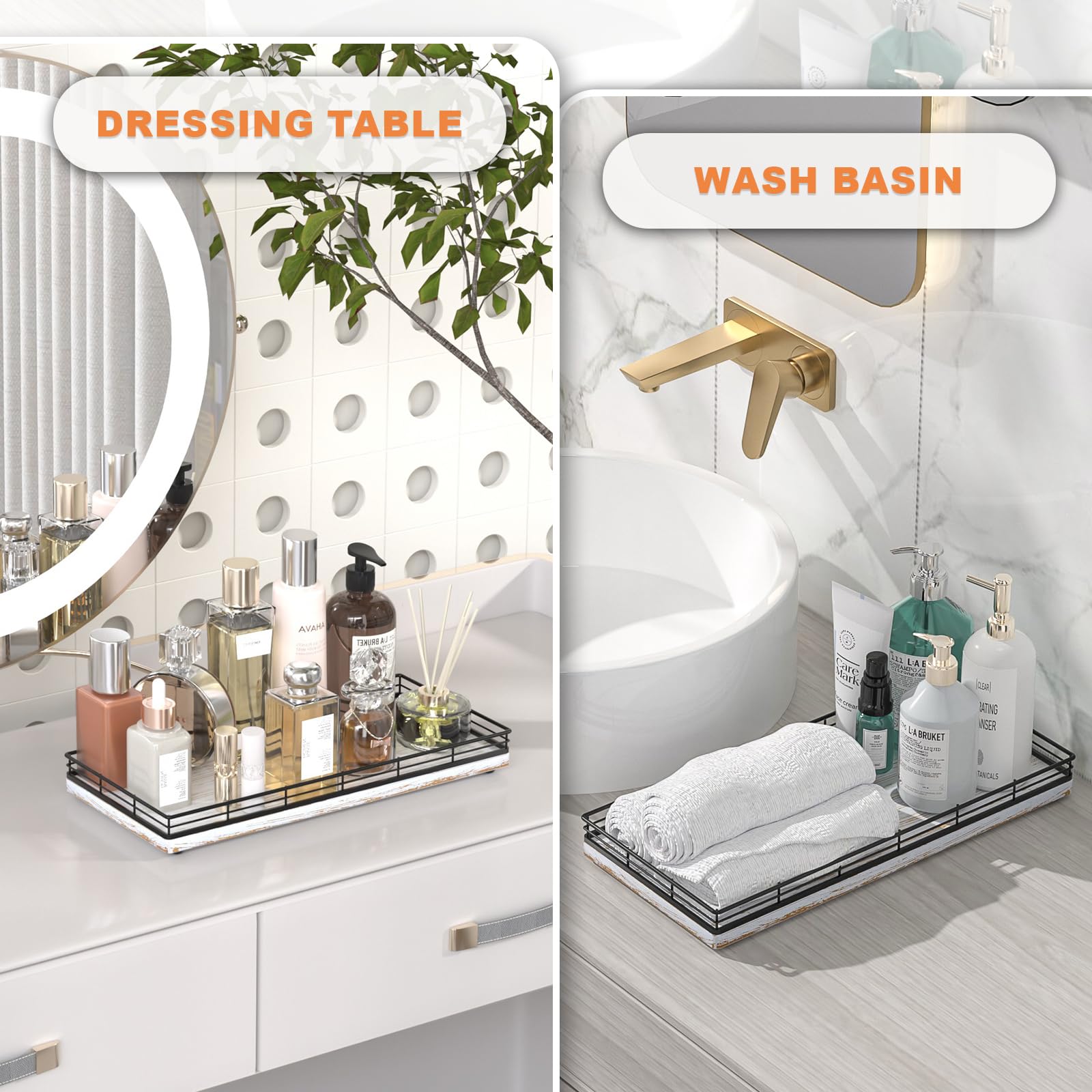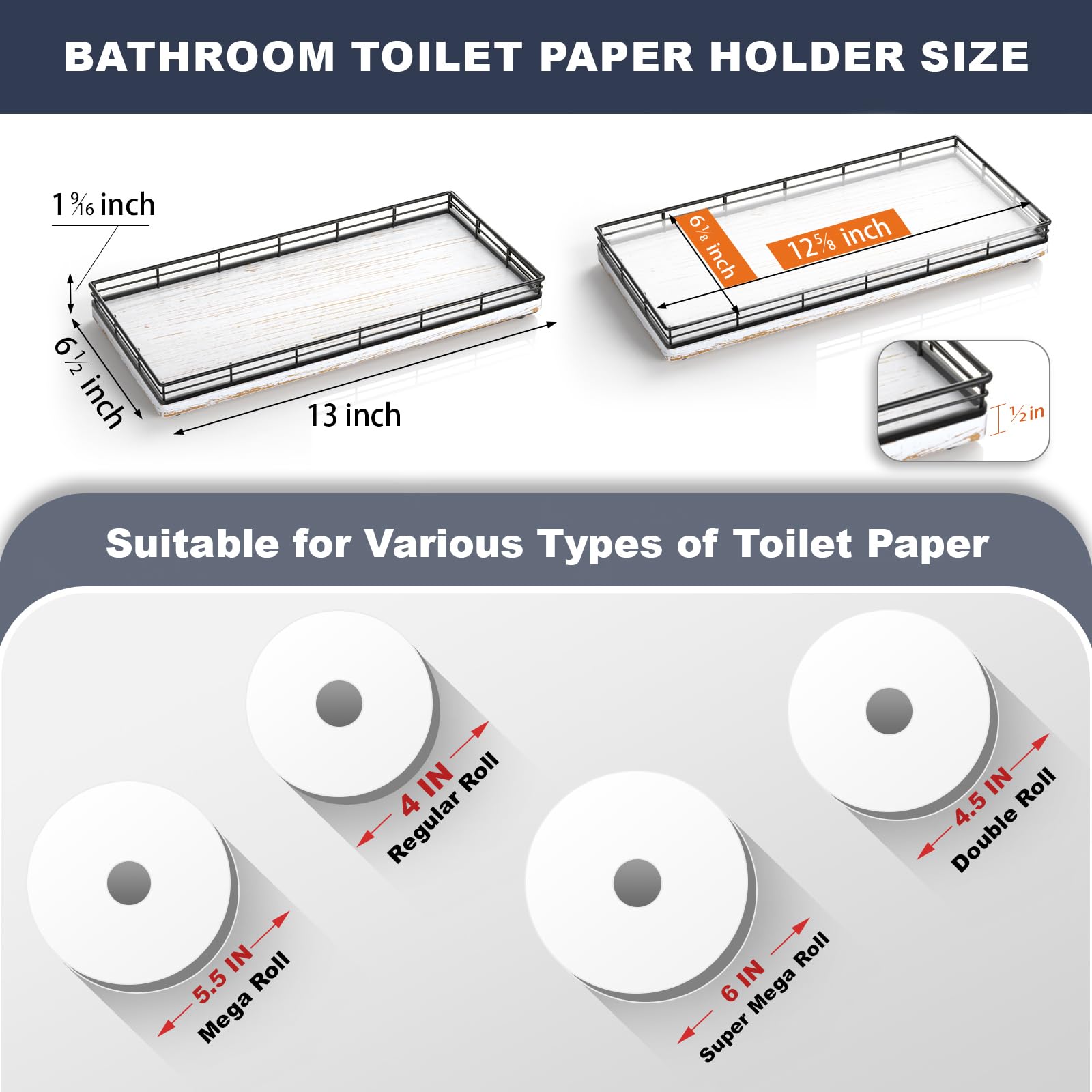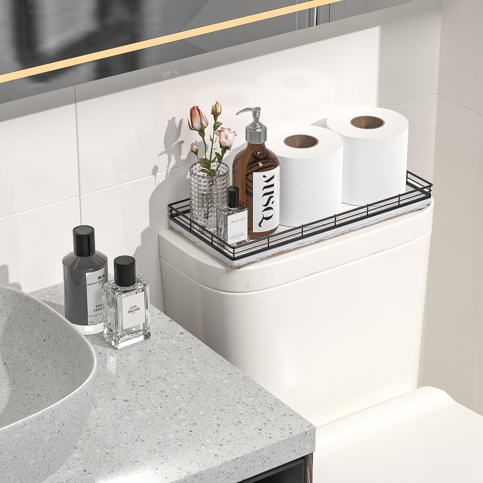Unique Charm: This 13 inches large wood rectangle toilet tank tray ensures durability and increased load-bearing capacity; Elevate your space with a unique appearance featuring a combination of iron mesh edges and farmhouse white wood board; Distinctive and captivating grain pattern adds an exquisite touch of elegance and sophistication; This bathroom toilet organizer tray blends modern minimalism with farmhouse charm seamlessly