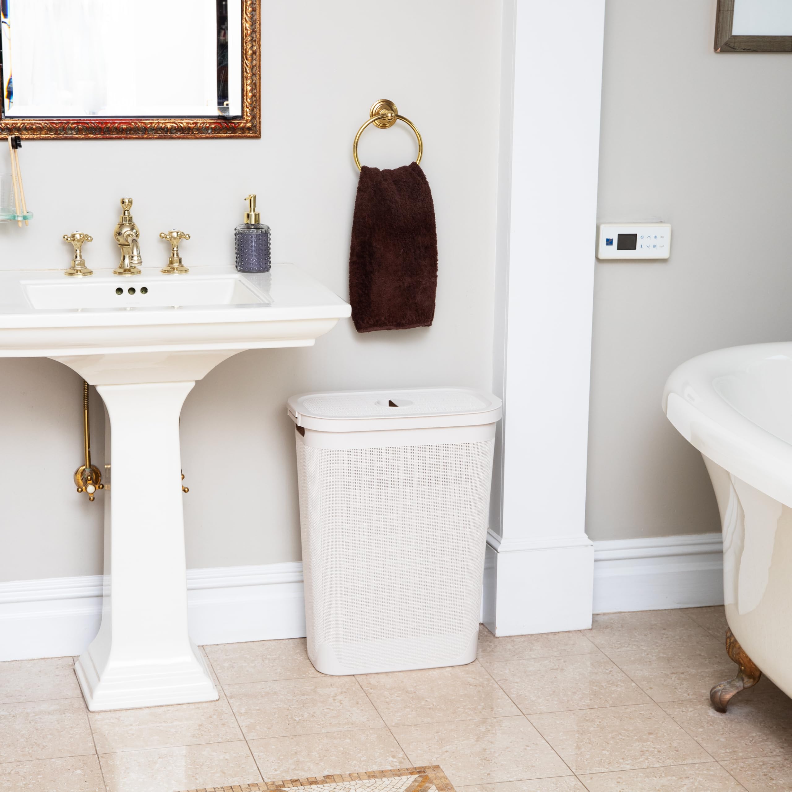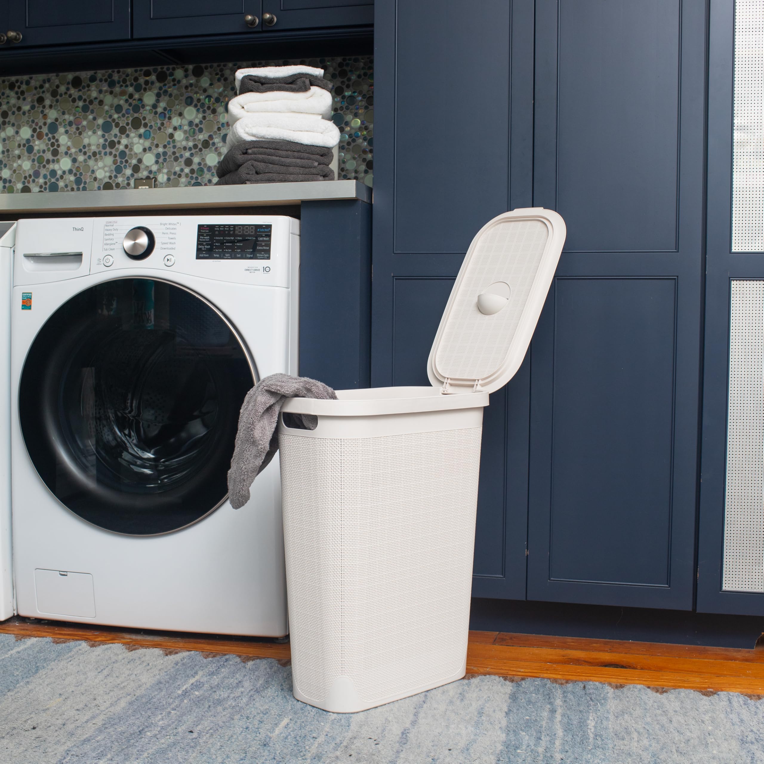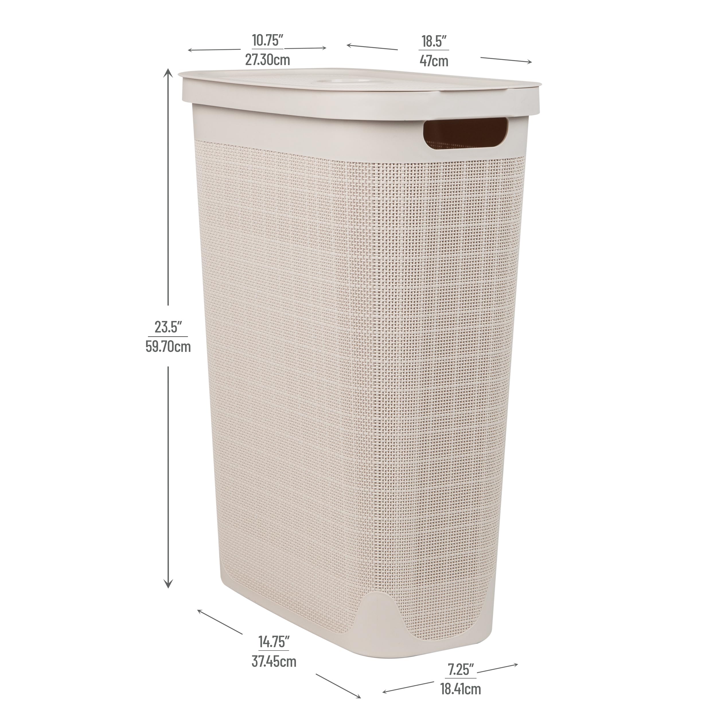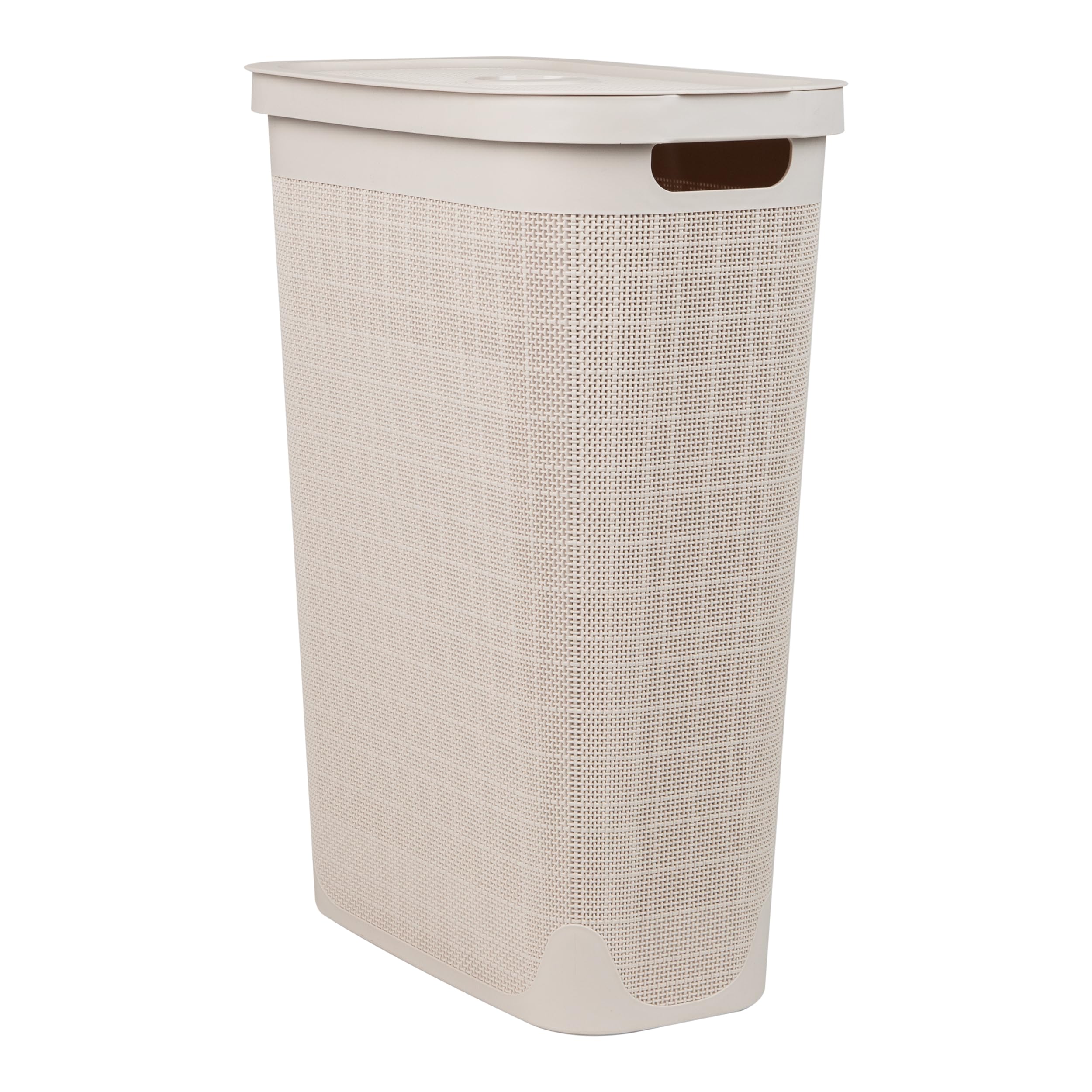Tackle laundry and clutter with the stylish and functional Mind Reader 40L Slim Laundry Hamper. Designed with a premium linen-texture finish, this compact hamper fits easily into tight spaces like bathrooms, closets, or beside the washer. The tapered silhouette provides ample storage while maximizing floor space. Lightweight yet durable, this hamper includes built-in cut-out handles for easy transport and a hinged lid to keep laundry out of sight. Whether you're collecting clothes, organizing toys, or storing seasonal items, this versatile basket makes everyday organization simple and elegant.