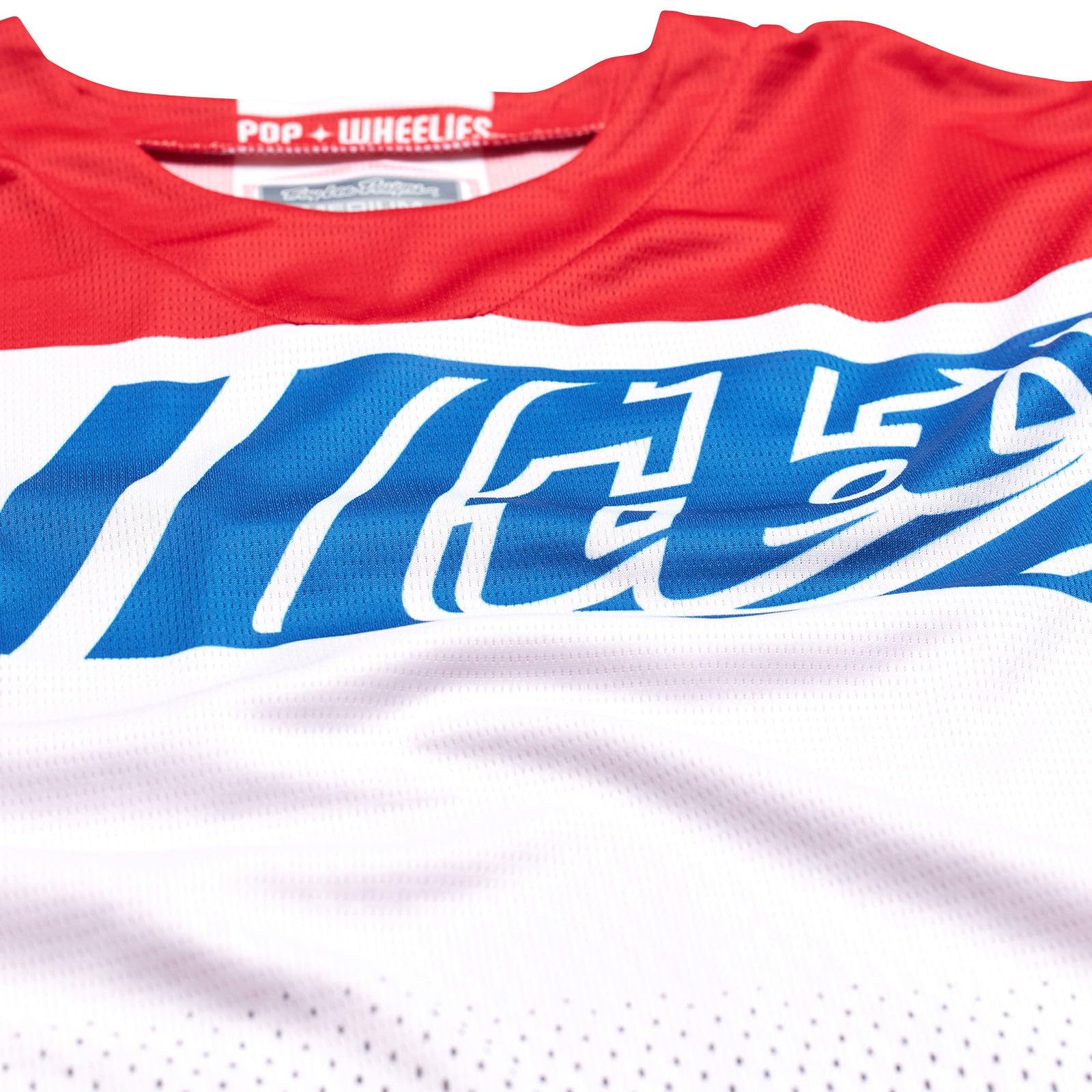 Description Custom Jersey with personalized name and number. Available in white. Made of soft, breathable material. Features adjustable sleeves and durable design.