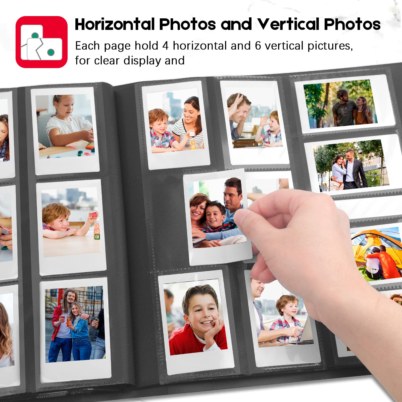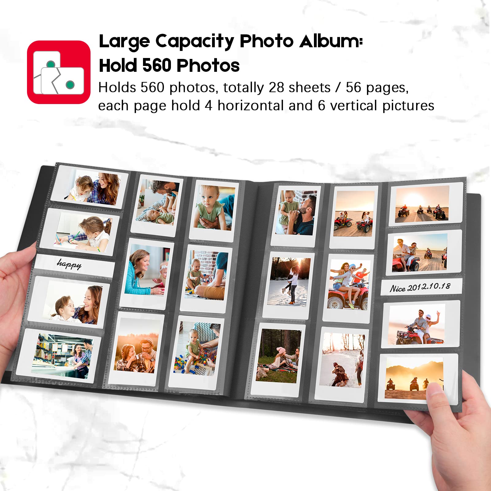 LARGE CAPACITY- STORE 560 PHOTOS: Hold 560 films in total, for Mini photo album contains 56 individual pages with 10 photos per page, opens like a book for easy viewing. A great way to keep your prized collection organized and in great condition.