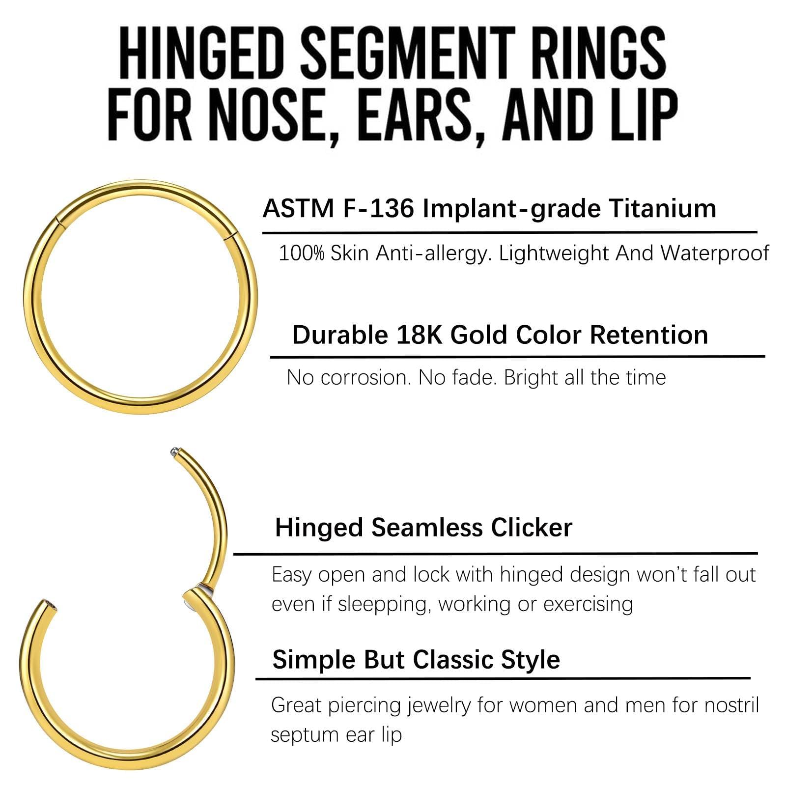 Description There is nothing like a small, dainty, thin, snug and perfect fitting jewelry to go with you body piercing. This hinged segment ring is very easy to use making it ideal for when you need to take your body piercing jewelry on and off on a regular basis. Made of ASTM F-136 Implant-grade Titanium and 100% hypoallergenic. Will not trigger skin irritation or reactions, perfect for those with metal allergies. Can be worn on Nostrils, Septum, Lip, Tragus, Earlobes, Cartilage and Conch Piercings. Why Choose Titanium Nose Rings? Titanium is an element that is completely hypoallergenic, so it's probably the best material for nose rings, especially if you have sensitive skin. ASTM F-136 Implant-grade titanium is the purest form and will not change or corrode if it's exposed to skin or bodily fluids. Additionally, titanium is an impressive, strong, and durable metal that holds its original color and does not fade over time. Finally, titanium is a low-maintenance metal that does not need time-consuming care. PROS: Approved by the Association of Professional Piercers. Won't cause allergic reactions. Is scratch-resistant and won't fade. Weighs almost 50% less than steel. ABOUT US If you're looking for a tiny jewelry to go with you body piercing, we can assure you that your search can end right here. Our mission is to help individuals express themselves through unique and high-quality body jewelry. We always believe that body jewelry is a form of self-expression and a way to show off one's individuality.