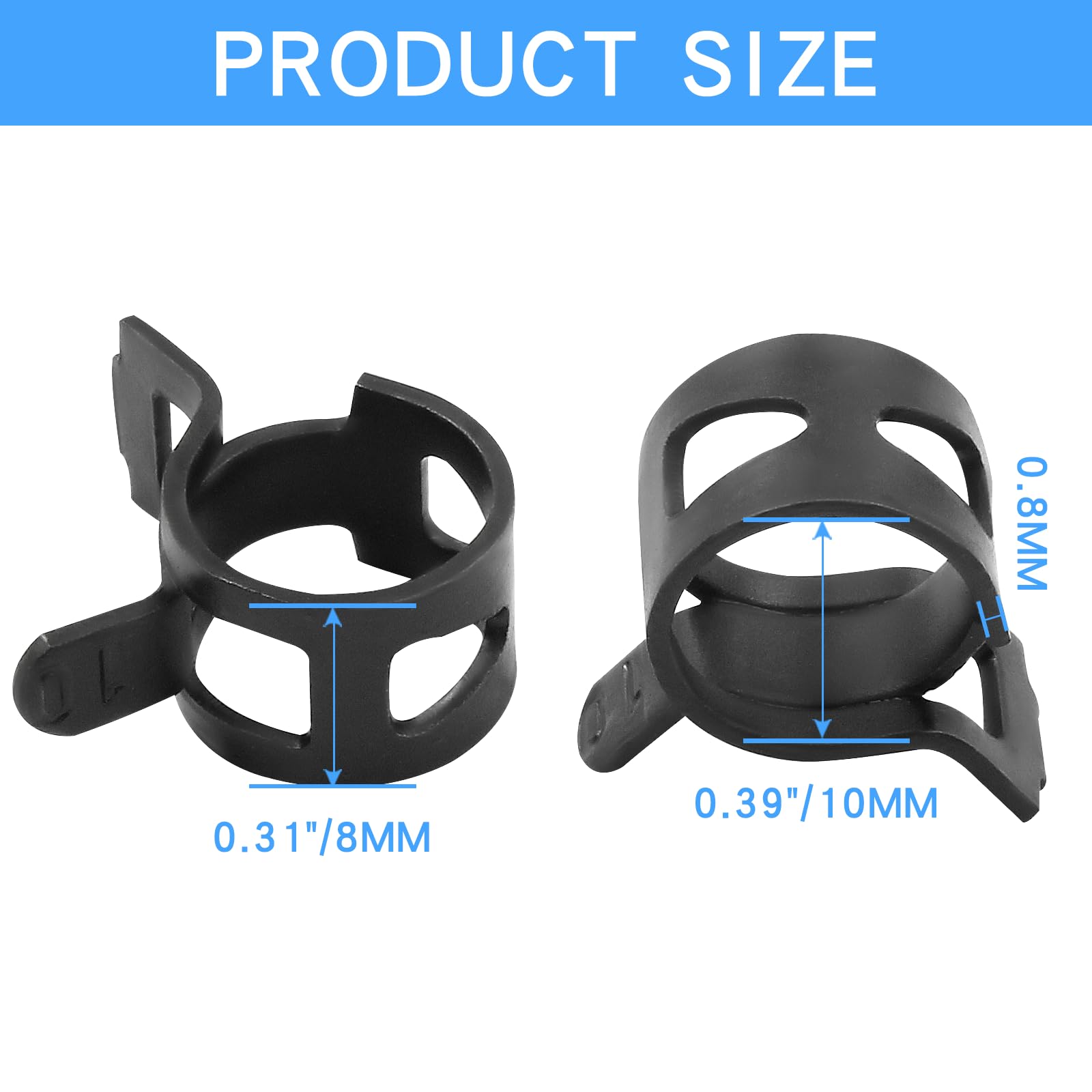 【Quantity and Size】Each package includes 50 ID Spring Band Clamps, providing you with an ample supply for your needs. Inner Diameter: 10mm/ 0.39"; Band Width: 8mm/ 0.31"; Fit Hose Diameter(OD): 10.5-11.2mm