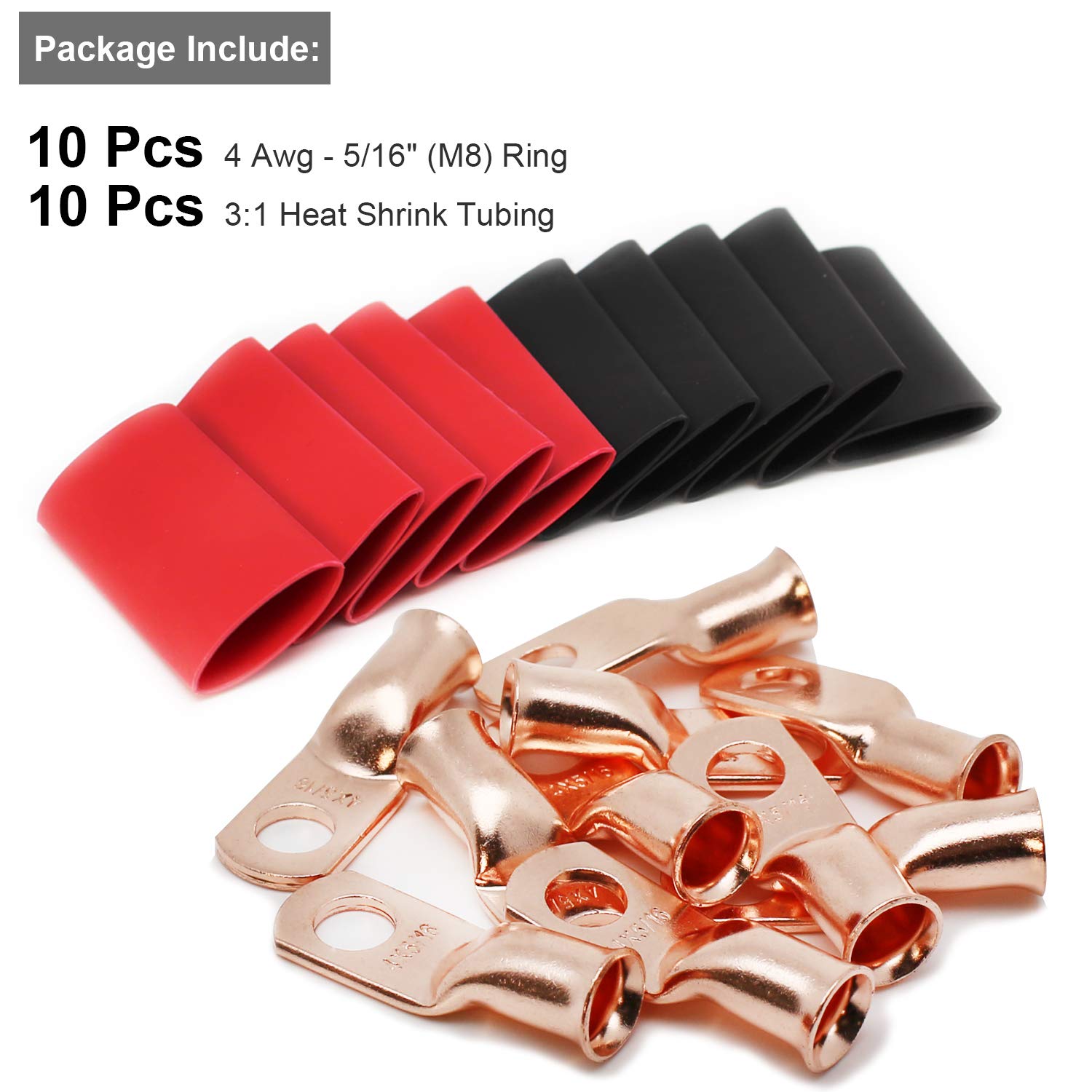 【What You Get:】 10 Pcs per pack of 4 Guage (AWG) 5/16" ring terminals, copper lugs closed end termination ring terminals with 10 Pcs 3:1 Dual Wall Adhesive Heat Shrink Tubing Tube for your work(5pcs Black and 5pcs Red).