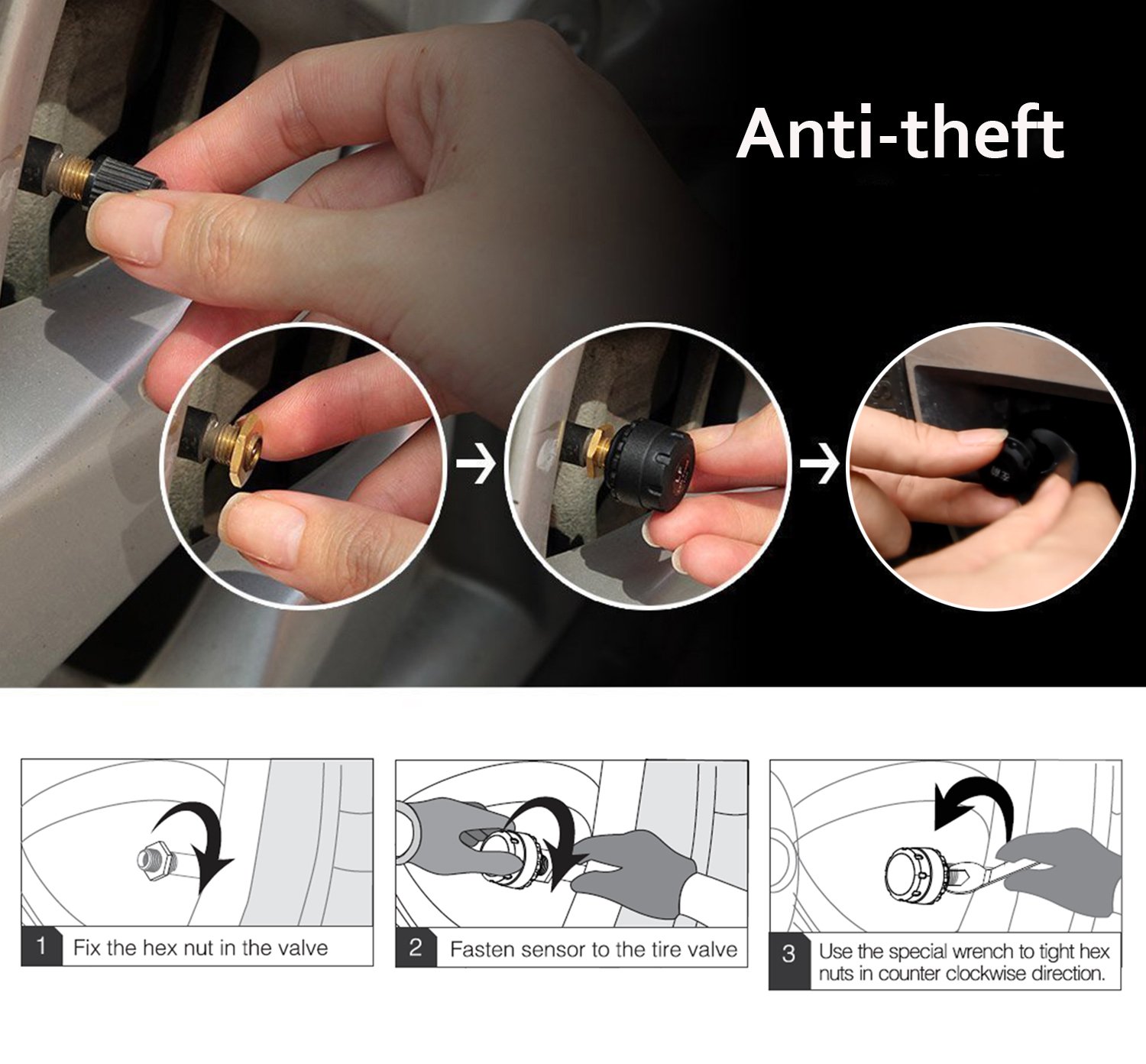 đăUniversal & Easy to InstallăThis tire pressure monitor system is universal for most 4-tire cars, especially old cars without TPMS, or for DIY. Simply mount the sensor onto the valve of the tire as per labeled (RR, RF, LF, LR)ďźthe sensors are already programmed, no need to program during the installation.