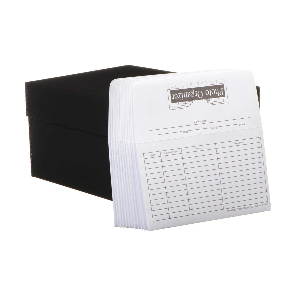 preserve your most treasured photographs with a museum quality archival, acid-free box. This Black Lineco Infinity photo organizing box comes with sturdy metal corners and is both acid & lignin-free. Made of calcium carbonate buffered board to neutralize airborne pollutants. Holds up to 1,000 3-1/2"x5" or 4"x6" photos with envelopes or 5"x7" without envelopes. Built-in metal corners for stacking strength. Includes 12 acid-free envelopes. Additional Photo File Envelopes sold separately. Cover is completely removable. Overall Size: 7-5/8"W x 5-1/2"H x 10-3/4" Long. PAT passed, archival quality, acid-free.