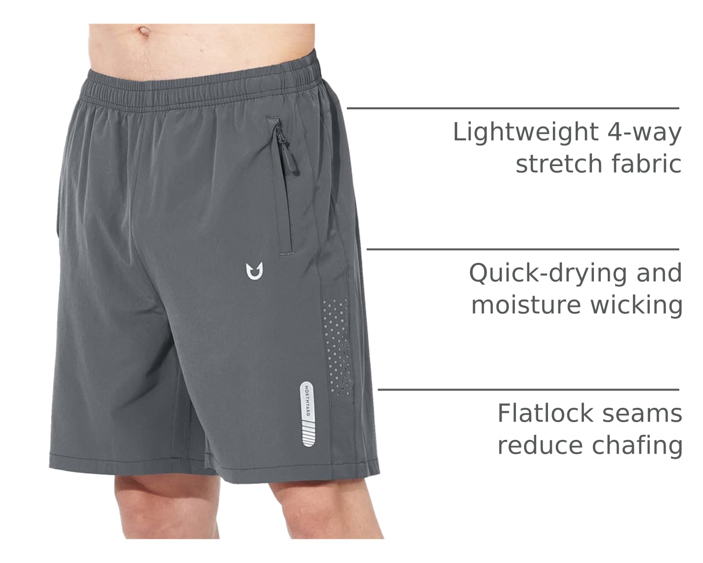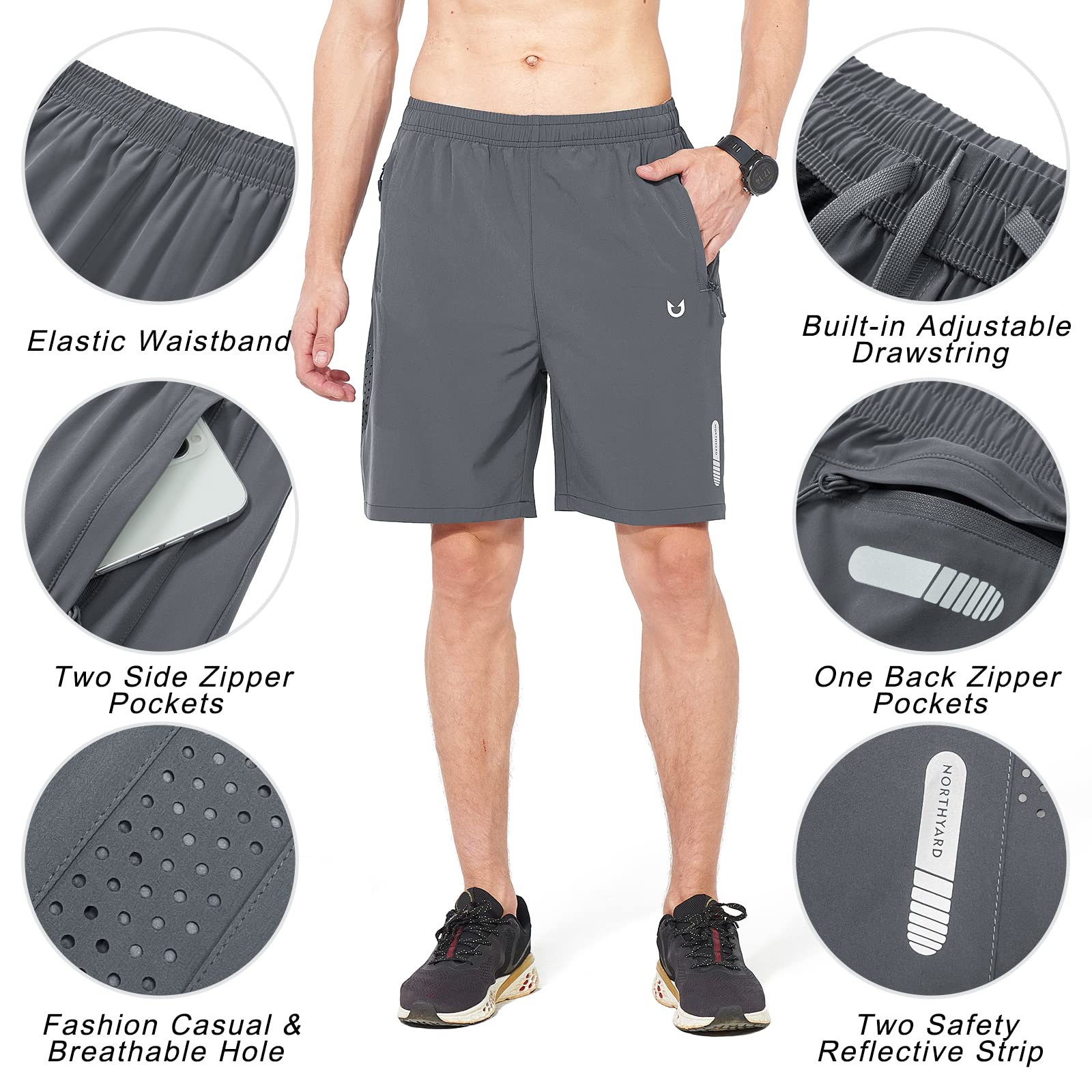 UNIQUE: Exercise cool Shorts have stylish casual breathable holes on both sides, designed exclusively by NORTHYARD Soft Elastic waistband/ built-in adjustable drawstring for custom fit, flatlock seams reduce chafe for additional comfort and ease of movementTwo stylish reflective strips at the front and back allow you to improve safety in low-light situations