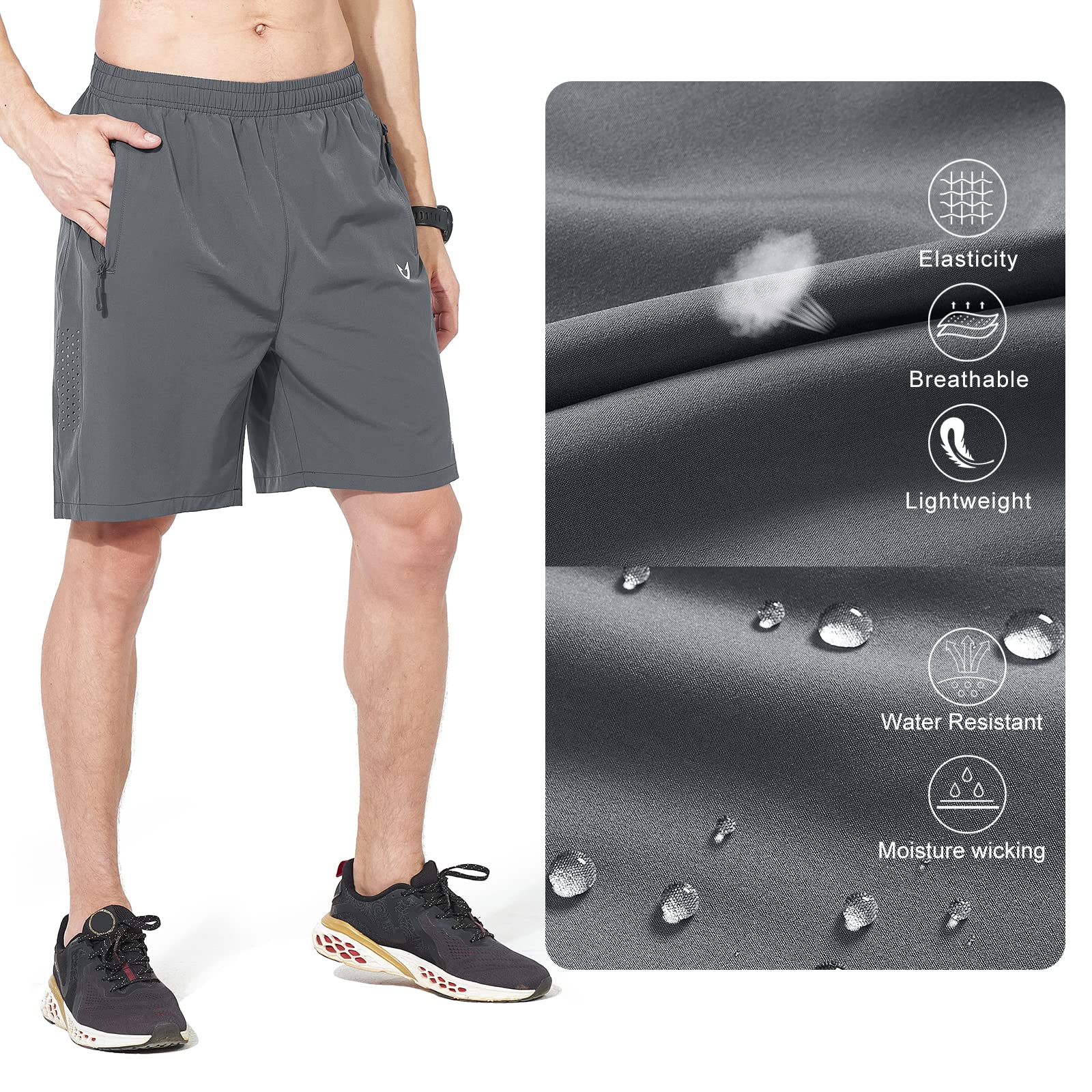 Lightweight & Breathability: Men's athletic hiking Shorts are made quality 4-Way Stretch/breathable and quick-drying fabric helps to wick away moisture and dry quickly keep you cool A synthetic of polyester and spandex can be very durable, abrasion-resistant, and stretchy enough to allow for better mobility