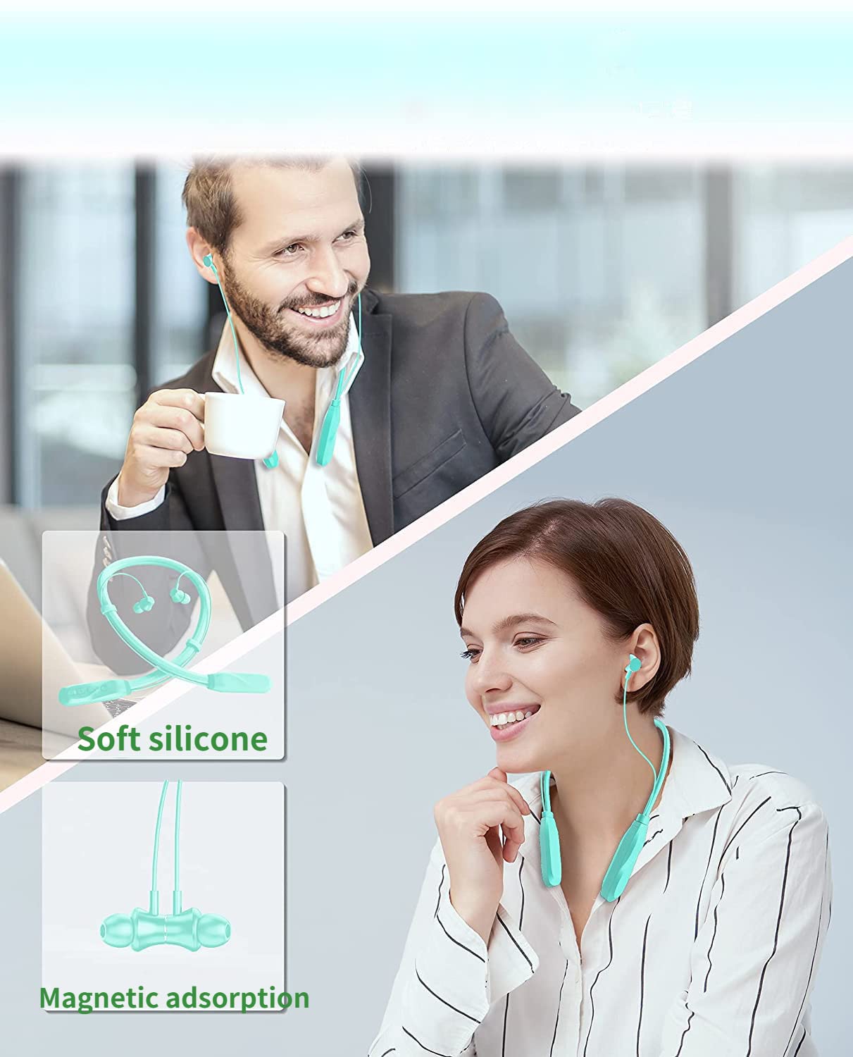 The neckband of these Bluetooth headphones is made of lightweight silicone and comes with three cap sizes to ensure a comfortable fit for everyone. The magnetic earbuds ensure tangle-free convenience when the headphones are not in use. Additionally, the IPX5 waterproof casing protects the earbuds from sweat, rain, and water, making them suitable for outdoor activities and workouts.