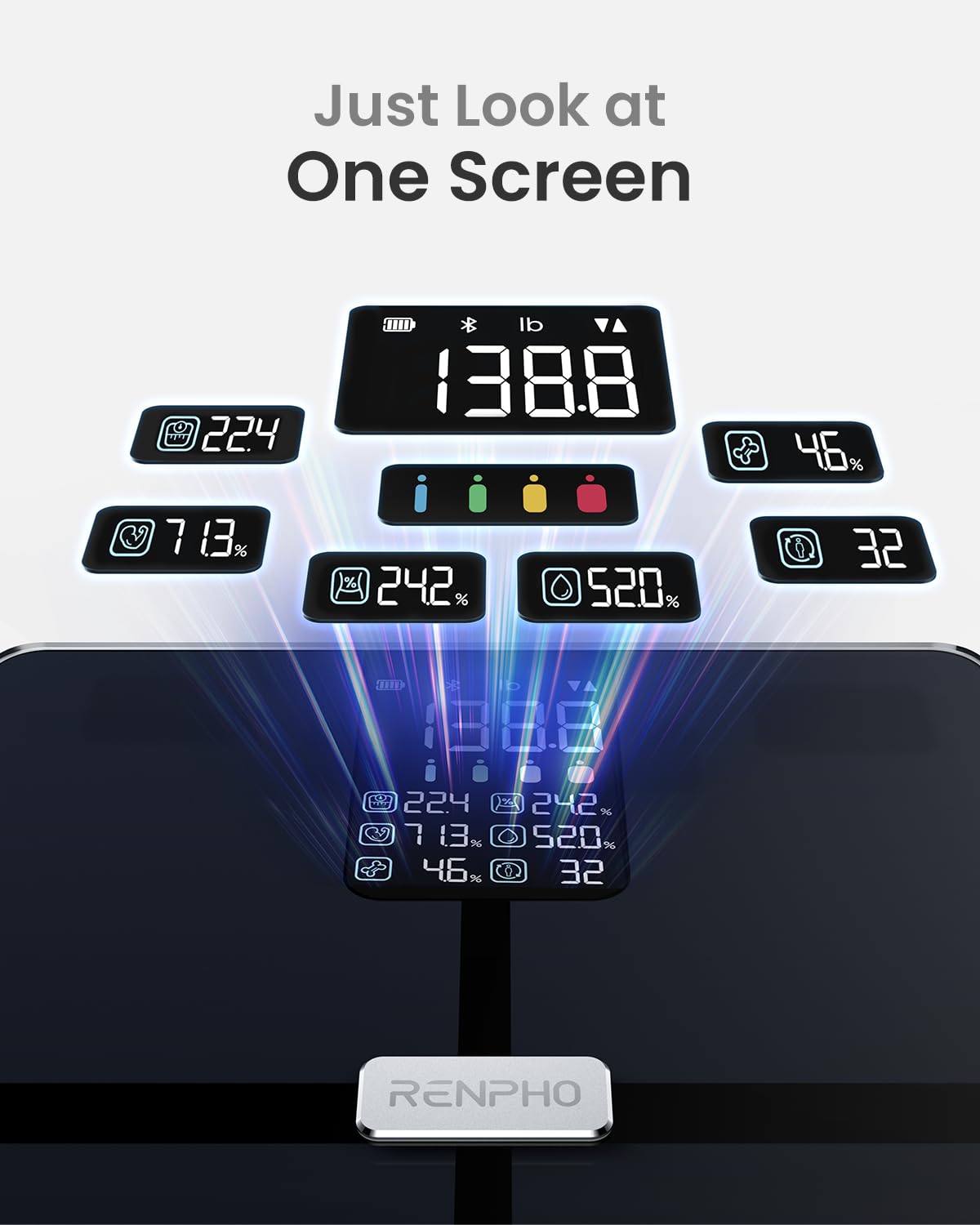 Sleek Design, Accurate Results: The modern, minimalist design with a high-precision ITO-coated surface not only complements your home decor but also enhances measurement accuracy, surpassing regular four-electrodes scales. Achieve accuracy down to 0.05kg/0.2lb.