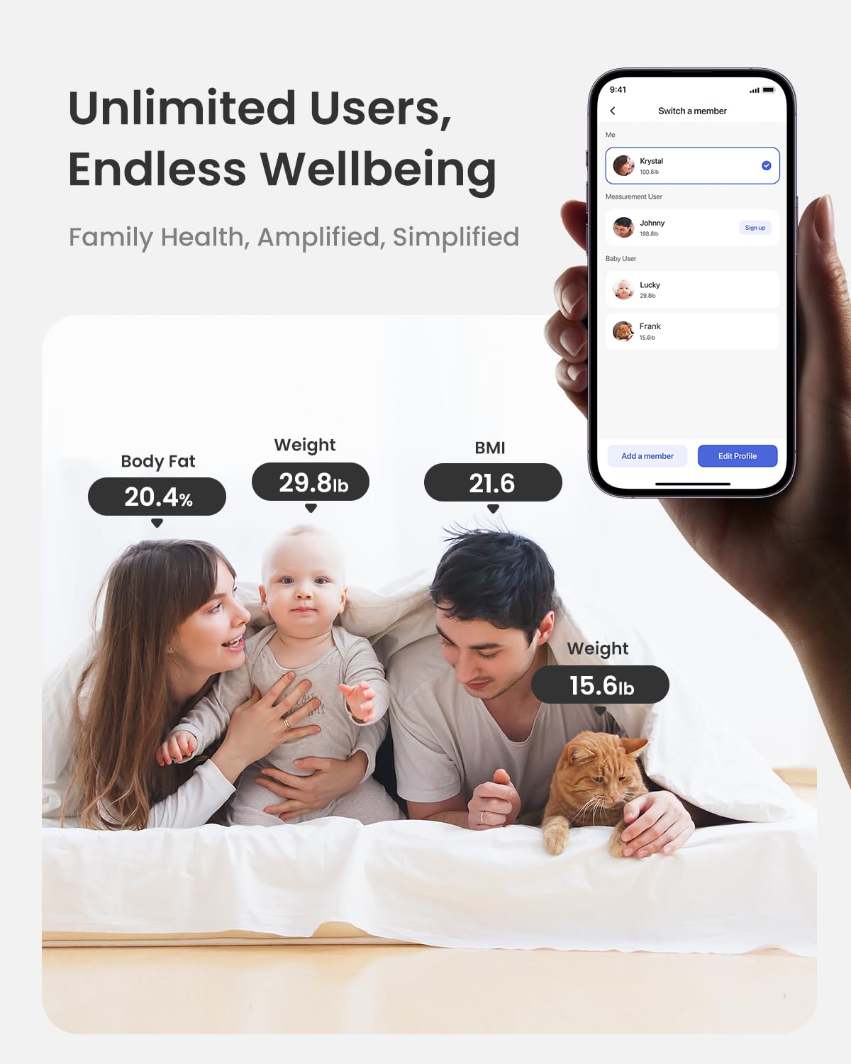 For Family & Pet-Friendly: Seamlessly connect to the app through the body fat scale, offering pet and baby weighing modes, unlimited user profiles for household use, and a specialized athlete mode to cater to diverse individuals and lifestyles.