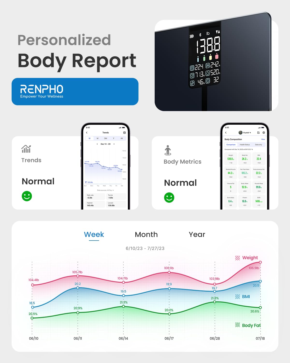 Detailed Body Analysis: Expand your health tracking by connecting this smart scale with the Renpho Health App, where you can analyze 13 detailed body metrics, observe long-term body trends, and set customized weight or body fat goals for a seamlessly integrated health management experience.