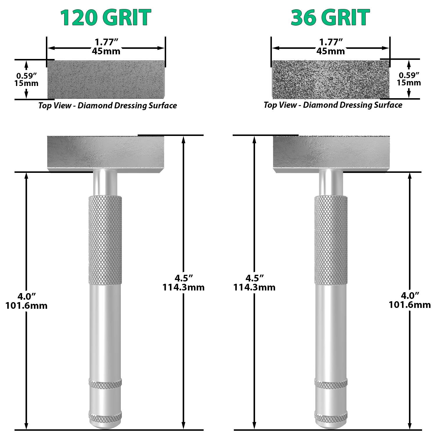 Size, Specs, Contents – Includes 36 grit and 120 grit dressing tools. Diamond head has an abrasive surface area of 1.77” x 0.59”, Overall tool length is 4.5”, Knurled handle length is 4.0”
