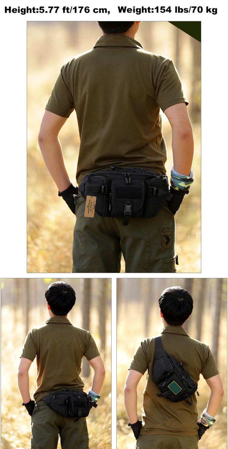 LARGE MAIN COMPARTMENT is big enough for carrying your ipad mini, cell phone, MP3, glasses, tactical flashlight, compass, kettle, cigarette, snacks, umbrella etc. The zippered BACK POCKET is hidden for extra protection about your passport, ID card, Credit card, wallet and essential stuffs. 3 Front pockets can be used to save your gadgets, small parts