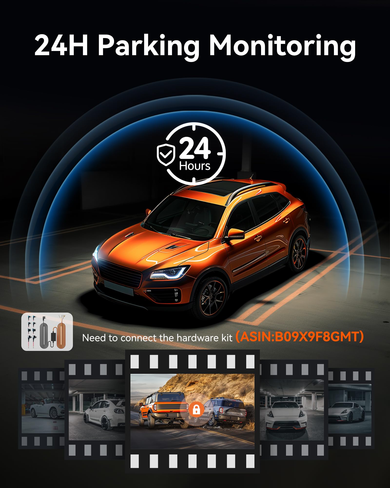 LOOP RECORDING, G-SENSOR, PARKING MONITOR: Loop recording of the mirror dash cam front and rear will automatically overwrite the old files when the card is full. G-sensor detects a sudden collision and locks the collision footage, so the rearview mirror camera won't overwrite locked files; the Parking monitor functions as a surveillance camera system while the vehicle is off (need to be powered by a WOLFBOX hardware kit,extra purchases)