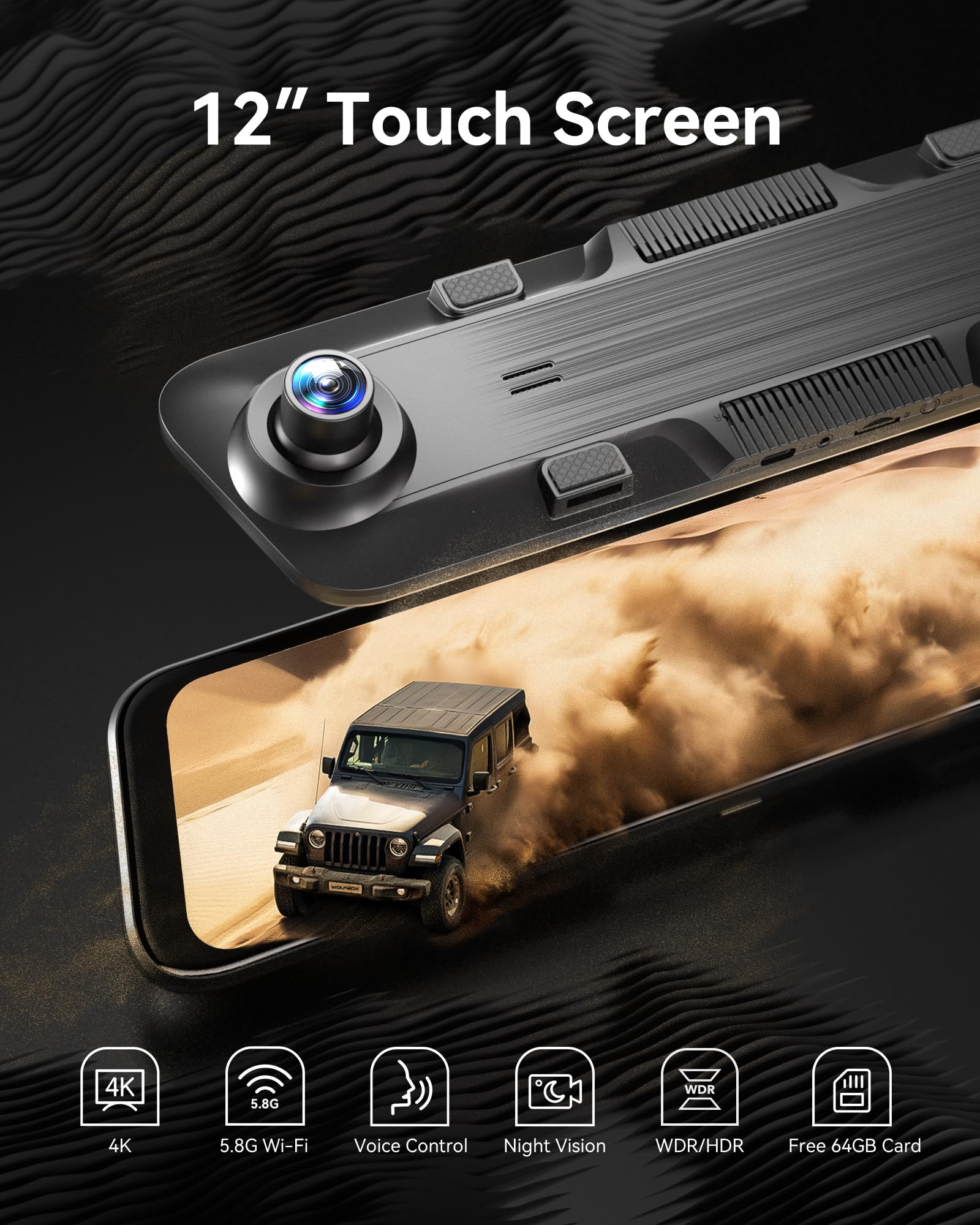 LARGE SCREEN & REAL 4K: With its 12-inch 4K front camera and WDR rear camera, the G850 mirror dash cam from WOLFBOX offers a super clear and smooth video experience, enabling you to easily read important details like road signs and vehicle number plates. This advanced technology takes into account both high-quality performance and cost-effectiveness