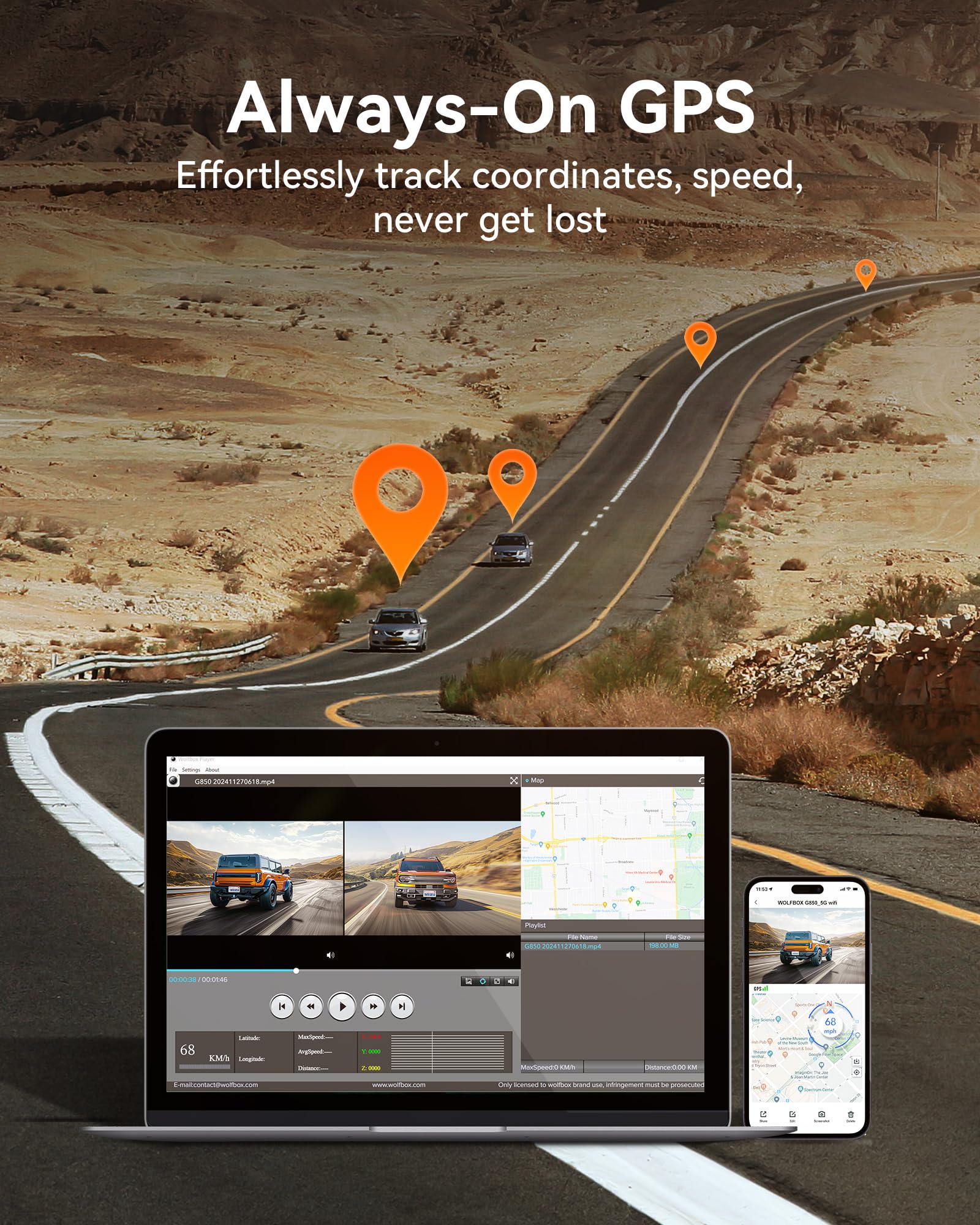 64GB CARD & GPS INCLUDED: You can use the dash cam directly without having to purchase any additional accessories. The GPS and exclusive WOLFBOX Player features allow you to display your driving direction, speed, position, and route. This information could potentially serve as important evidence in the event of an incident