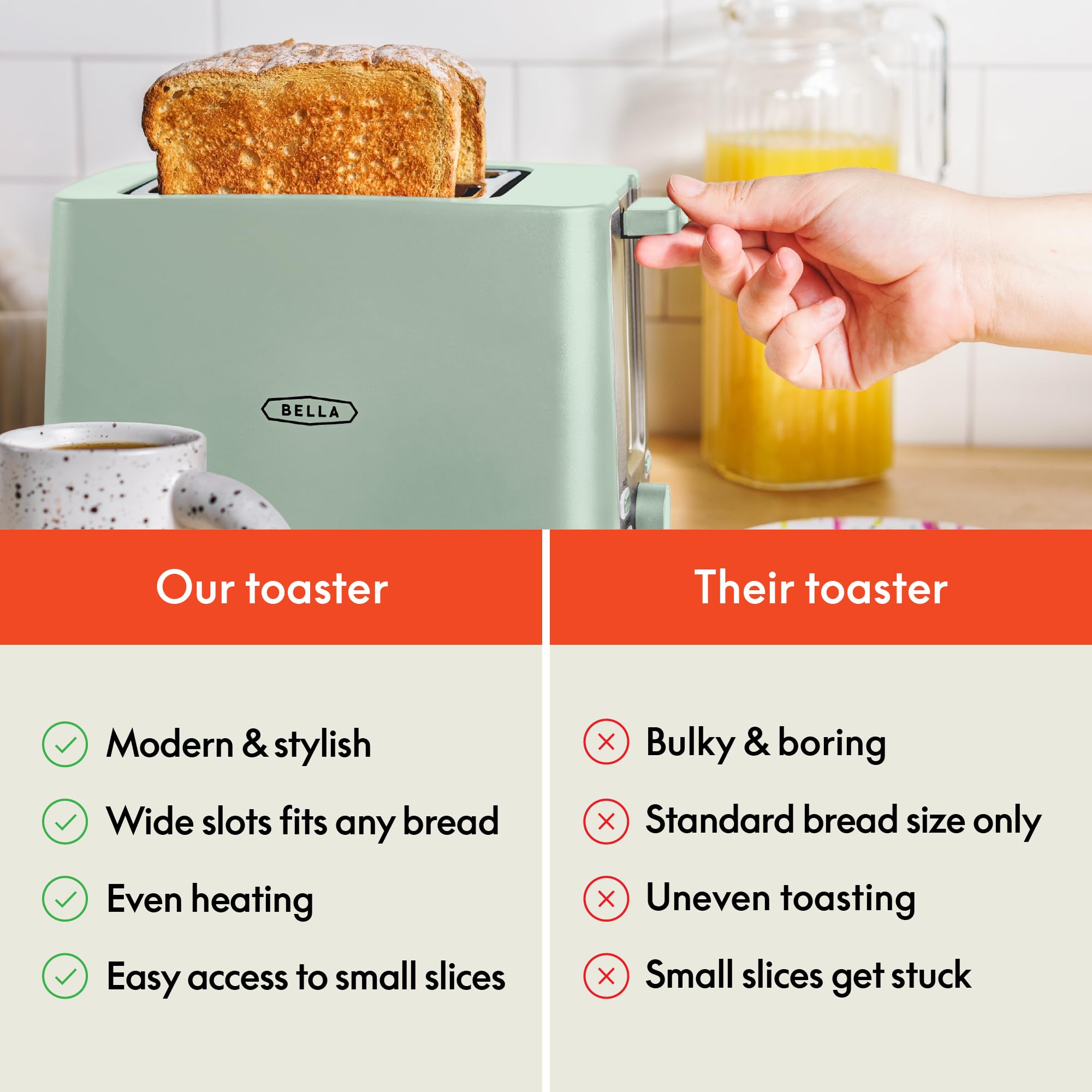 SAFE FOR THE WHOLE FAMILY - BELLA's bread toaster features an anti-jam and auto shut-off function to provide an extra layer of safety and if you change your mind, the reheat function and cancel button will let you take full control of your breakfast