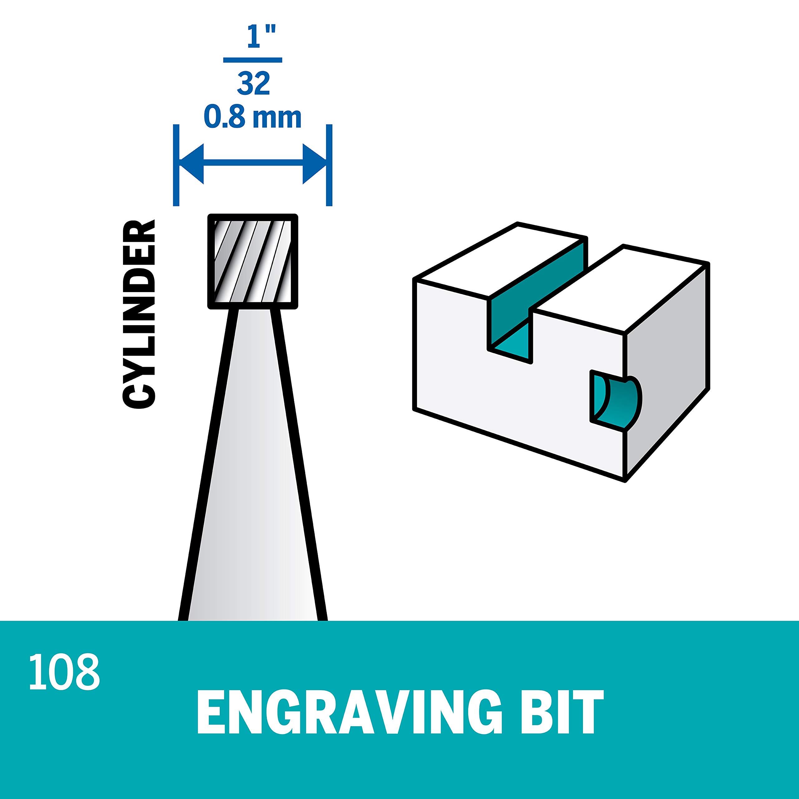 Make the most of your Dremel rotary tools by using our innovative & extensive line of rotary accessories and attachments. Whatever your project, weβve got the perfect solution for you. Dremel accessories fit inside your rotary tool to extend itβs versatility. Whether youβre looking to carve, engrave, cut, sand or grind, there is a Dremel accessory to get the job done with pinpoint precision. Thatβs why our purpose-built Dremel accessories let you get your project right down to the last detail. Dremel accessories are also color-coded into usage categories to make it easier for you to select the right accessory for your project. The versatile 1/32 In. (0.8 mm) diameter Engraving bit is made of high-grade steel for use on wood, plastic, leather, soft metals & rubber. For use with all Dremel high-speed rotary tools, the accessories work well for detailed material removal in applications like shaping, carving, engraving, hollowing, grooving, slotting, inlaying, making tapered holes, or freehand routing. The cylinder shape of the Engraving bit allows for deep removal of material, cuts flat areas, round edges and makes stop cuts and V-cuts. The accessory tip makes flat bottom slots and grooves, flat side cuts, and makes V-cuts when held at 45-degrees. Compatible with all Dremel corded and cordless rotary tools. Thereβs no need to hunt for the right collet, all Dremel rotary accessories feature a 1/8β standard shank.