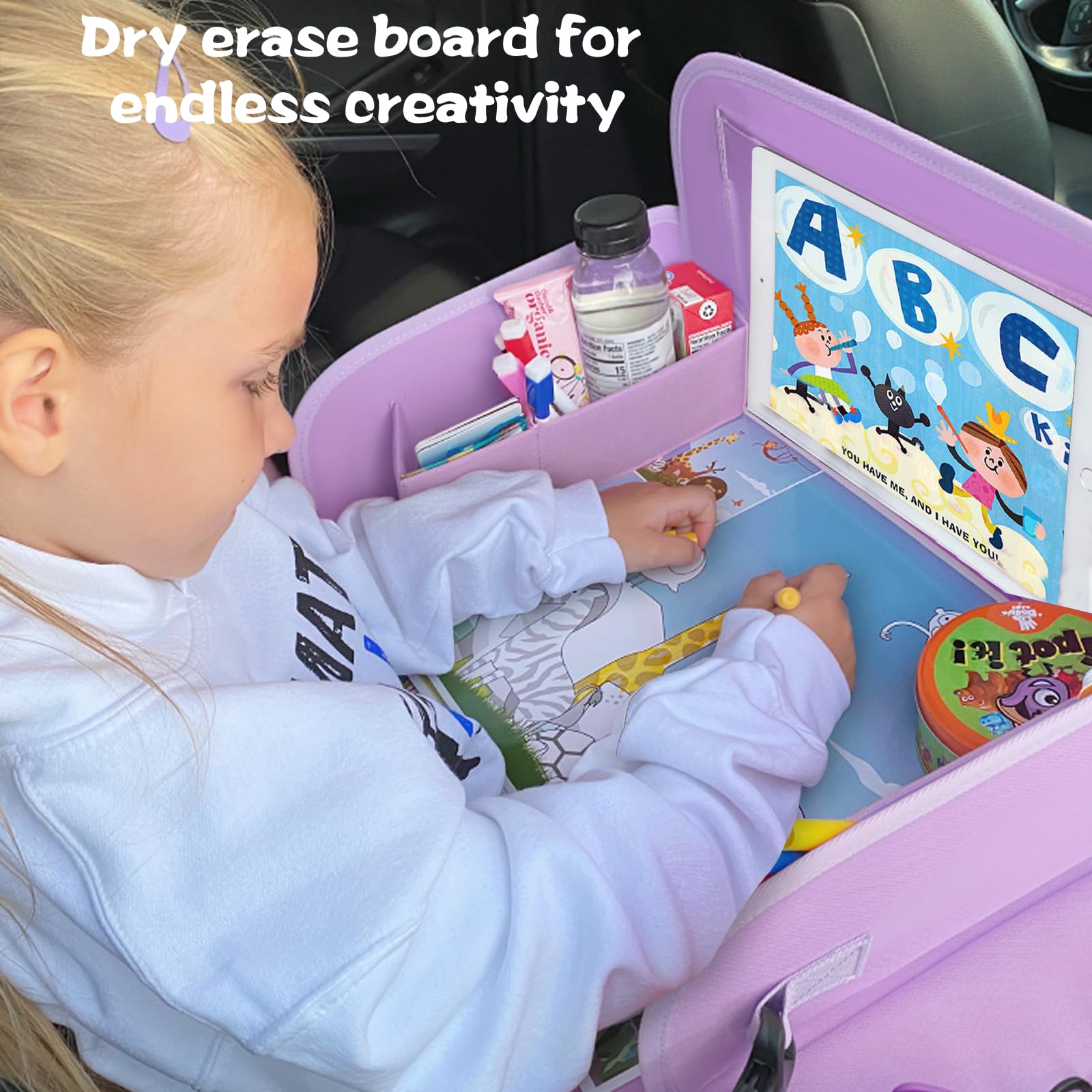 Entertaining At Their Fingertips: MENZOKE kids travel tray for car seat is a kids road trip essentials and airplane travel essentials. Kids use the car lap desk for hours of entertainment instead of being bored. With the toddler travel tray, kids can doing kids travel activities like watching iPad, drawing, eating and drinking while you concentrate on resting or driving. The toddler travel tray for car seat can be a good choice as a toddler birthday gift and christmas gift for toddler girl