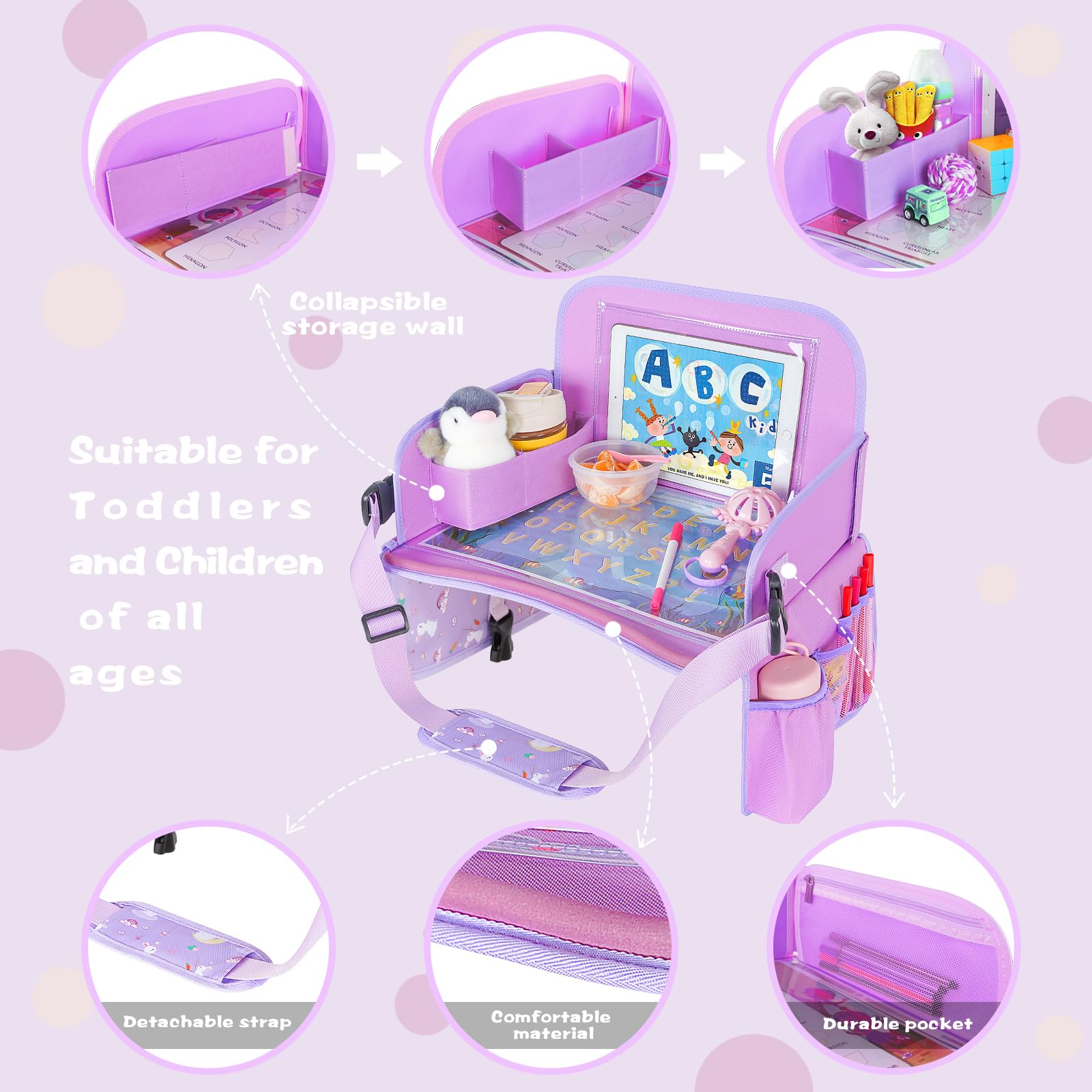 Best Protection For Your Kids: MENZOKE kids travel tray for car seat are made of Polyester 600 D without any smell. Strong toddler car tray and reinforced sutures enhance the durability of this kids car table that you could use in car, plane, stroller frequently. The warm design - raised soft edges and rounded corners will make children more comfortable - it not only ensures safety and convenience but also makes a considerate and practical gift for toddlers and families who love to travel