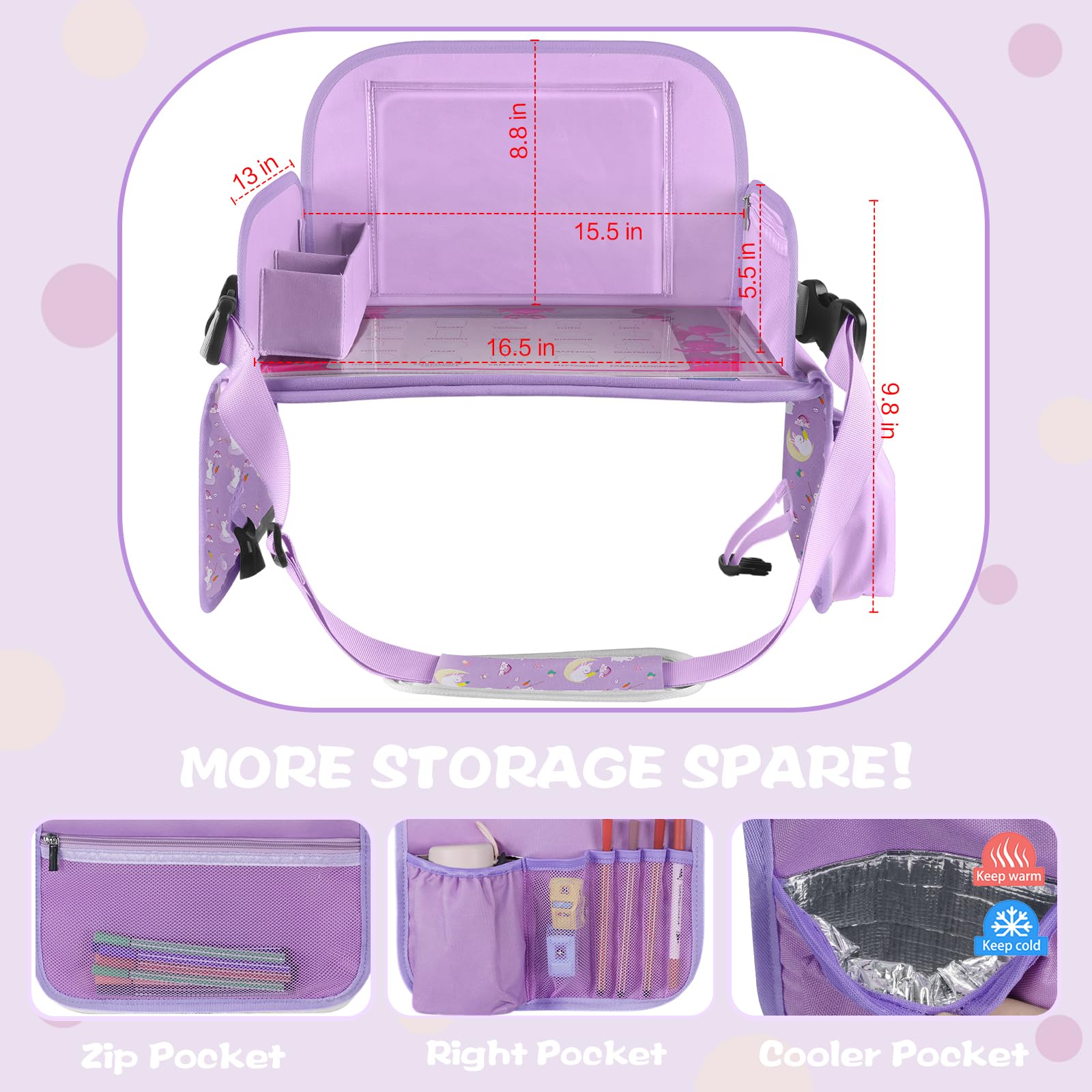 Powerful Storage Space: The car seat tray for kids travel equips with a cup holder, 2 zipper pockets, pen holders, and a collapsible storage compartment, allowed to hold snacks, and crayons, car seat toy. Large tablet stand holder fits most iPads or tablets while keeping the tablet from falling over bumpy road rides. It will be a perfect car seat tray for kids travel for satisfying needs of kids travel activities of all kinds - and also makes a gift choice for birthdays, or family love to travel