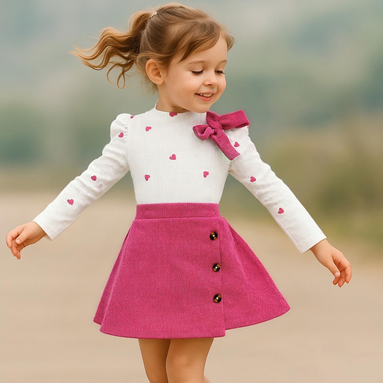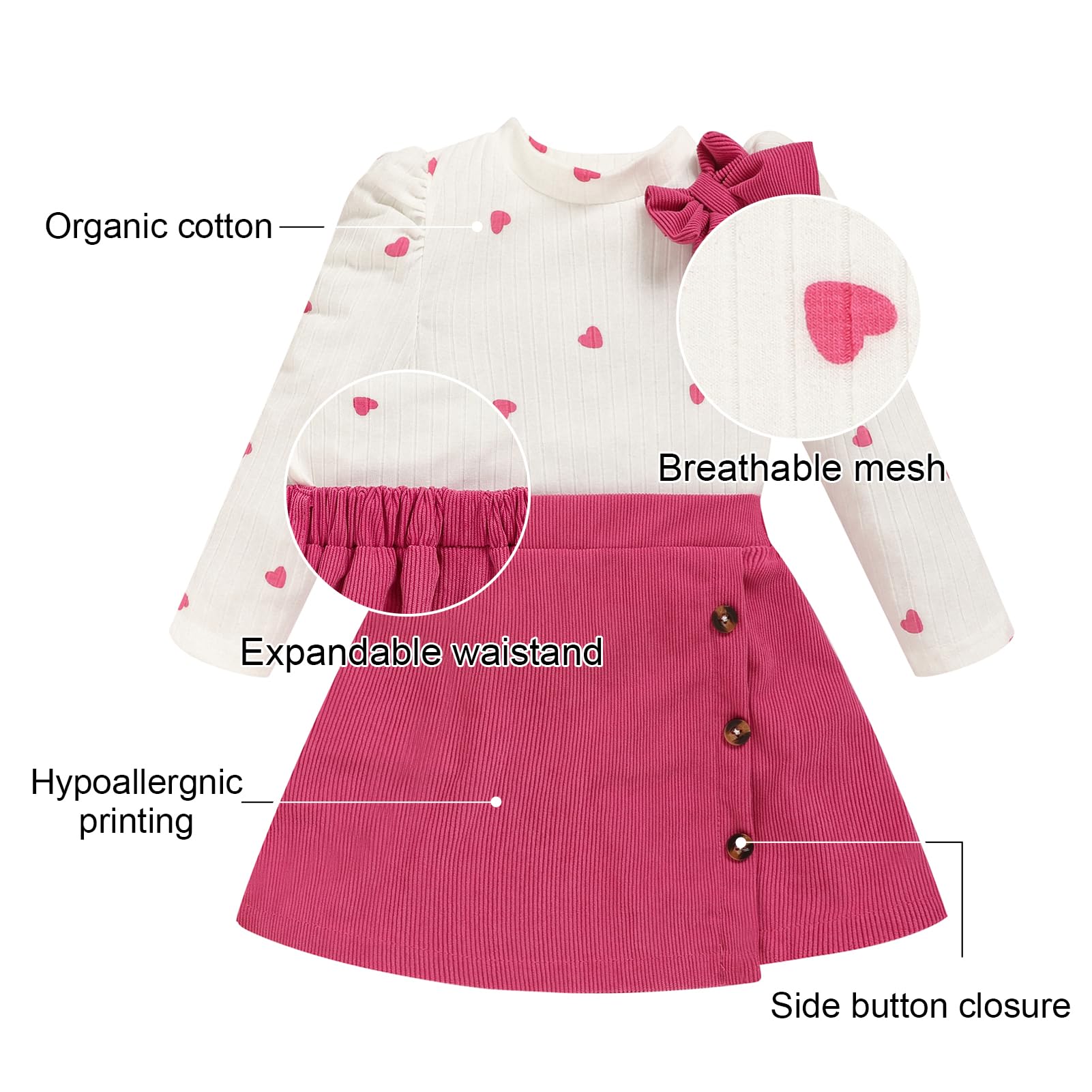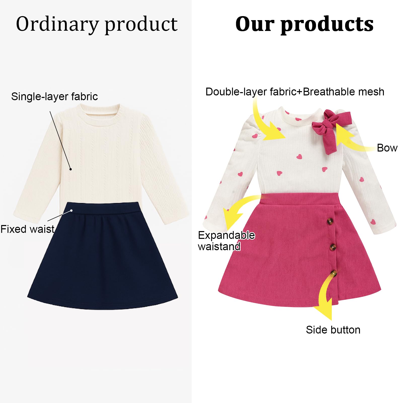 MATERIAL: Toddler girl shirt sweater top is made of cotton and polyester, bottom skirt is made of cotton blend and polyester, soft, breathble, and comfortable, sweet toddler baby girl 2 piece skirt set, cute baby girl clothes.