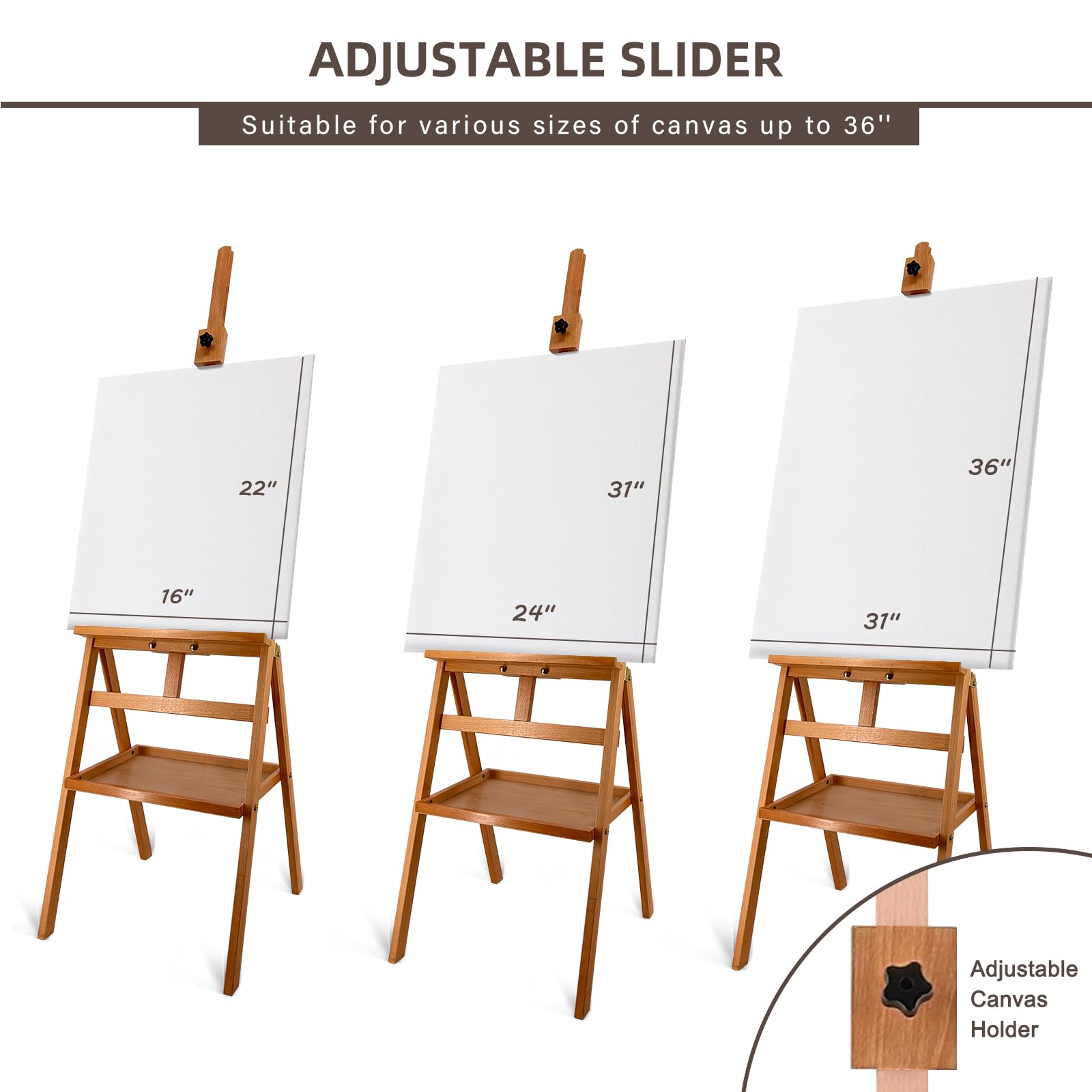 Various size of Canvas: Without tools, you only need to rotate the upper squared part to fit your canvas. You could put down oil canvas, drawing boards & display paintings within 36 inches.