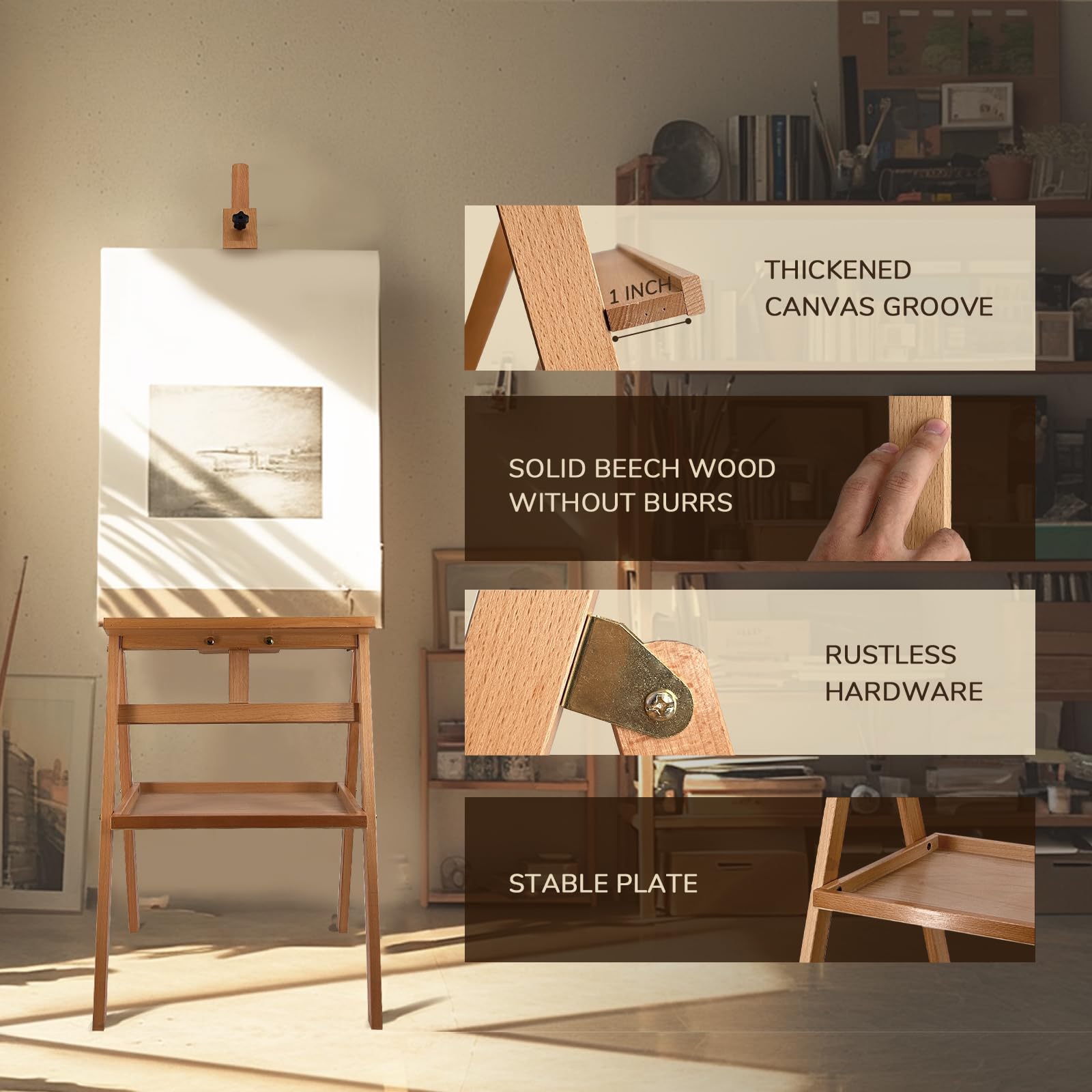 Solid Beech Wood: The H-frame art easel is made of premium beech wood without any burr. You could use the easel for years. ALL Hardwares are well-made. Easy Assembly with clear instruction.